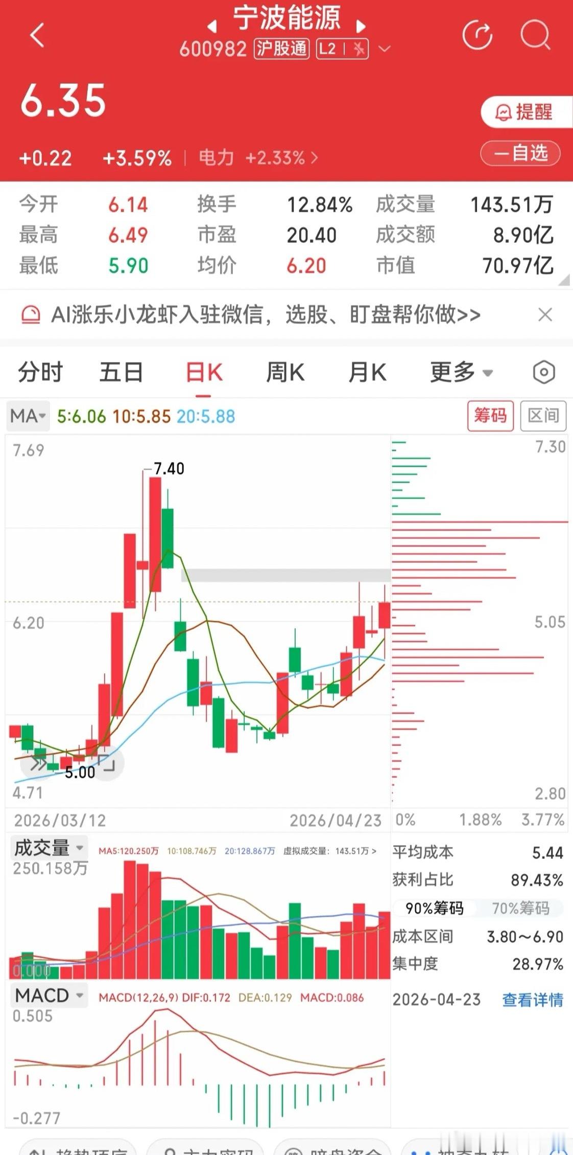 宁波能源:出现双针探底长下影线,前面回调底部企稳起来拉了一个涨停,后面回调后一直未走弱在 5 日线上运行