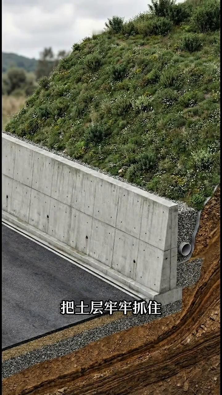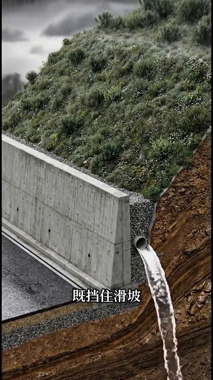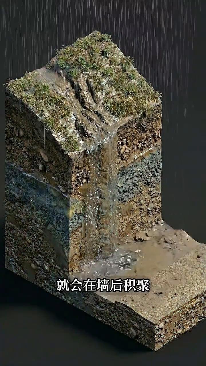 正确的做法是:先浇筑带钢筋的混凝土基础和墙体,再在墙后填充碎石并同时安装排水管。这样一来雨水渗进去之后就能快速穿过碎石层流进底部排水管排走,或者通过墙上的泄水孔,直接排出。只要墙后不积水,就不会形成巨大的水压挡土墙,自然就能稳稳挡住土体,长期保持安全。