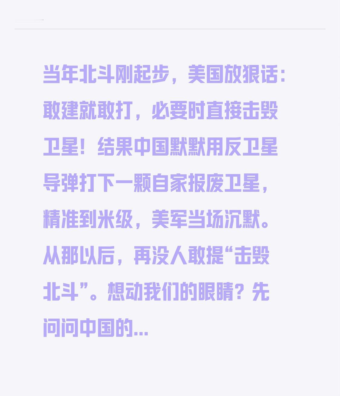 当年北斗刚起步,美国放狠话:敢建就敢打,必要时直接击毁卫星!结果中国默默用反卫星导弹打下一颗自家报废卫星,精准到米级,美军当场沉默。从那以后,再没人敢提“击毁北斗”。想动我们的眼睛?先问问中国的反卫星技术答不答应。 北斗系统 反卫星导弹