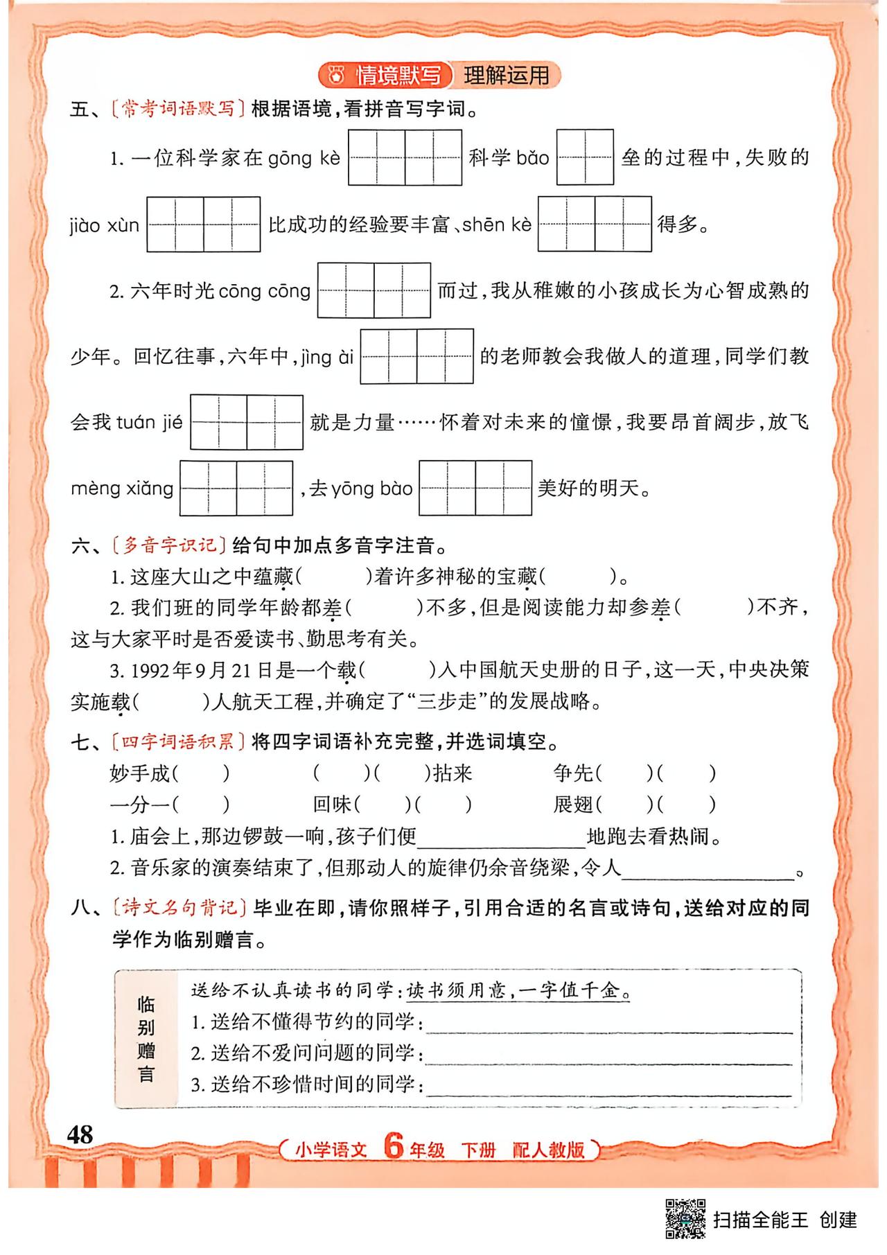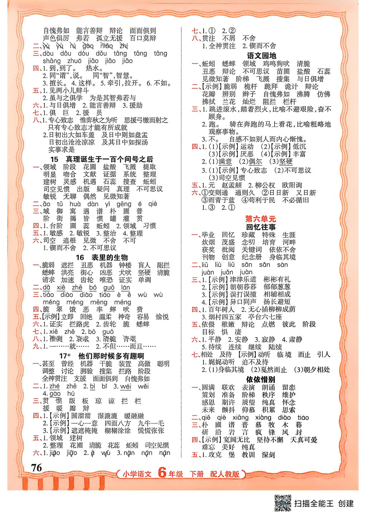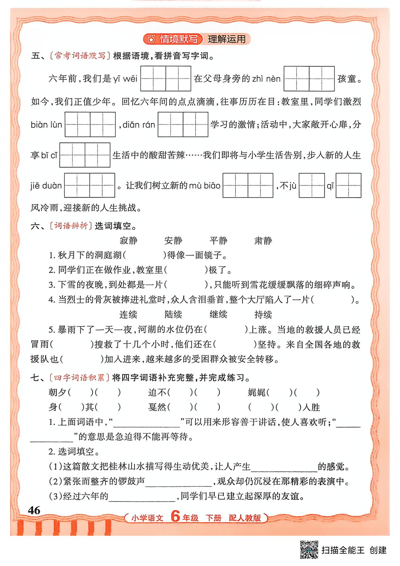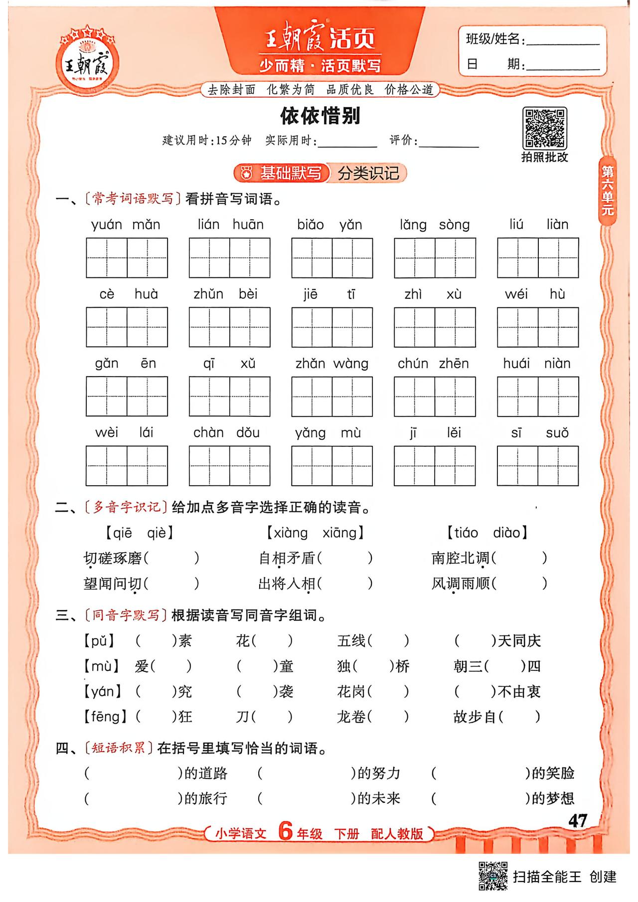 26春六年级下册语文,第六单元基础知识《活页默写》+参考答案,收藏练一练巩固知识