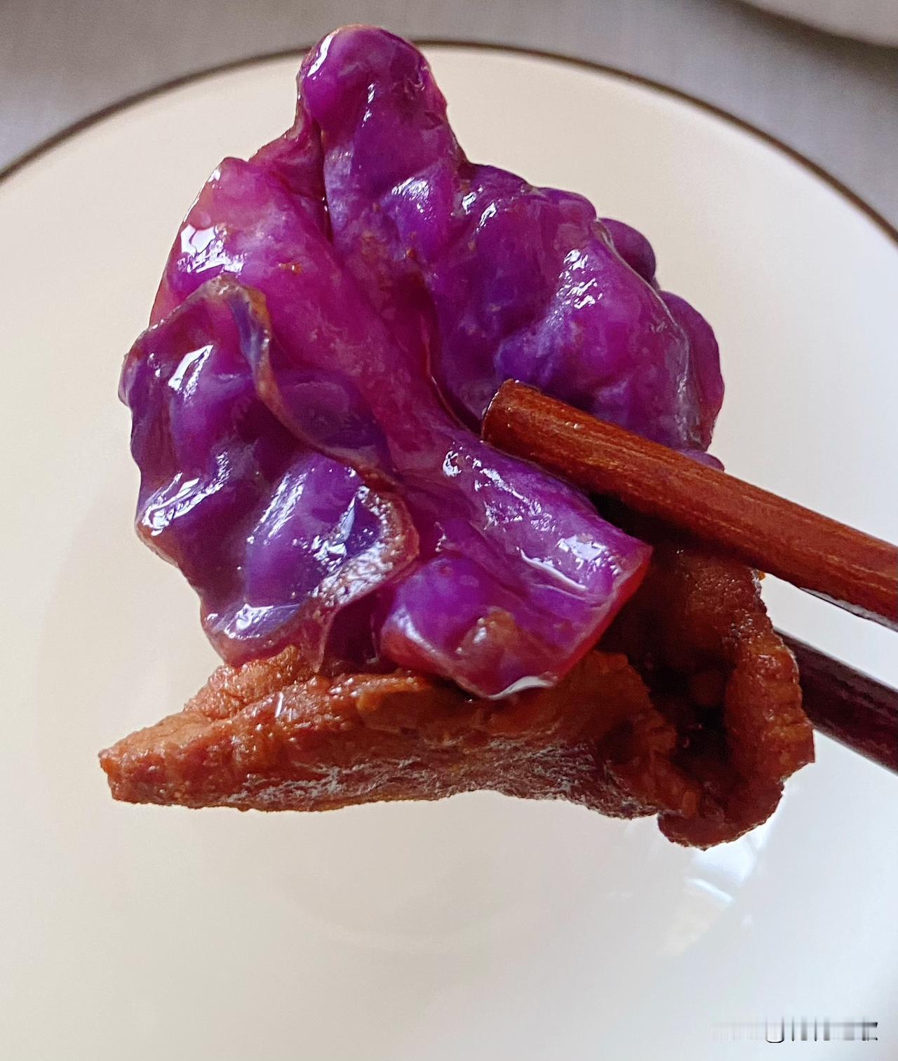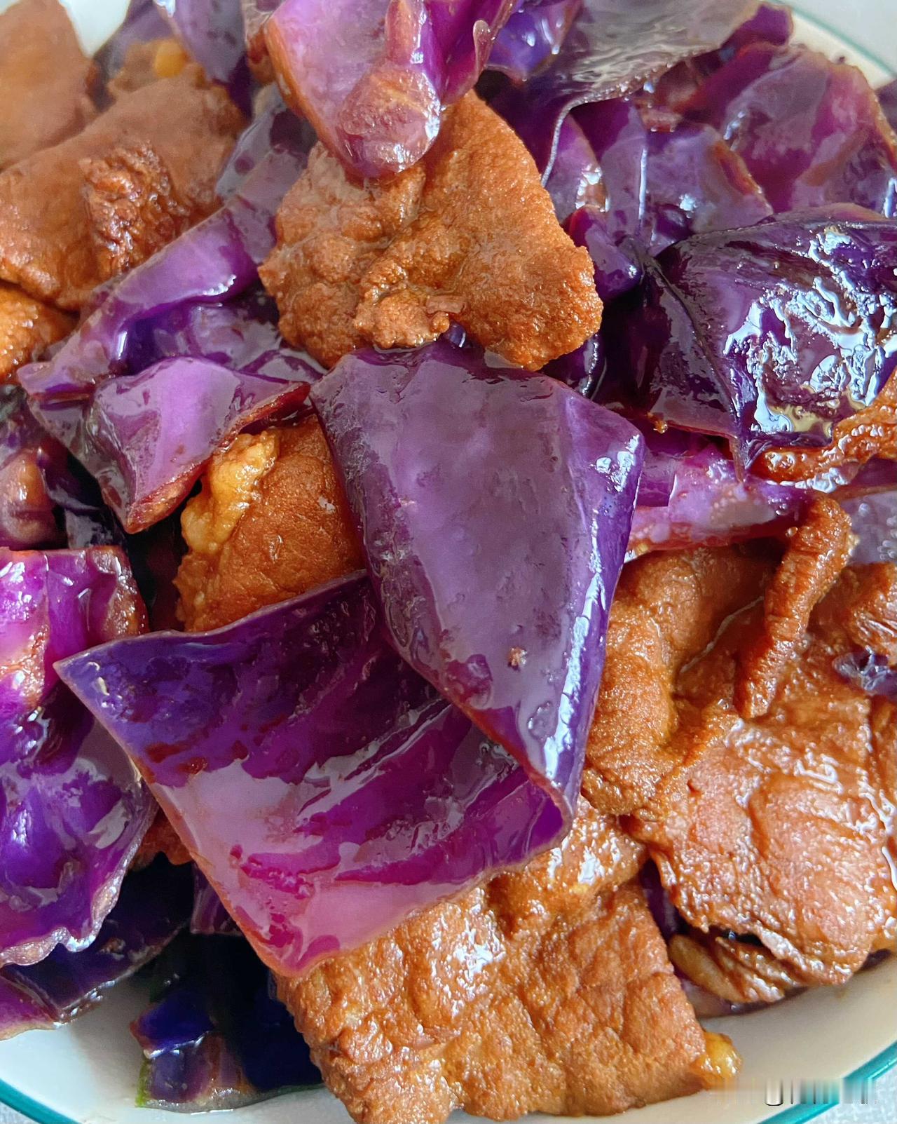新尝试菜:紫甘蓝炒肉(切成片搭配肉炒出来脆脆的,还挺好吃的)