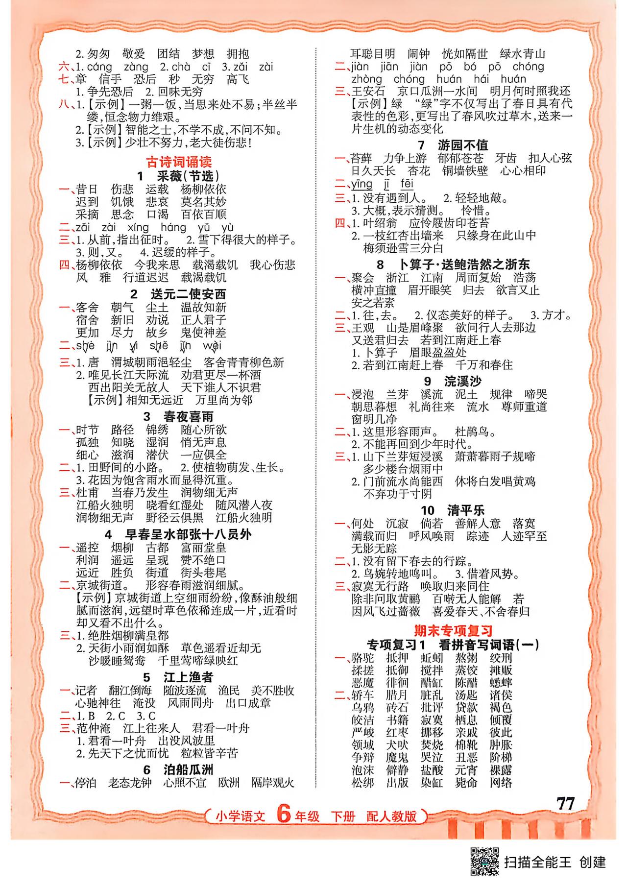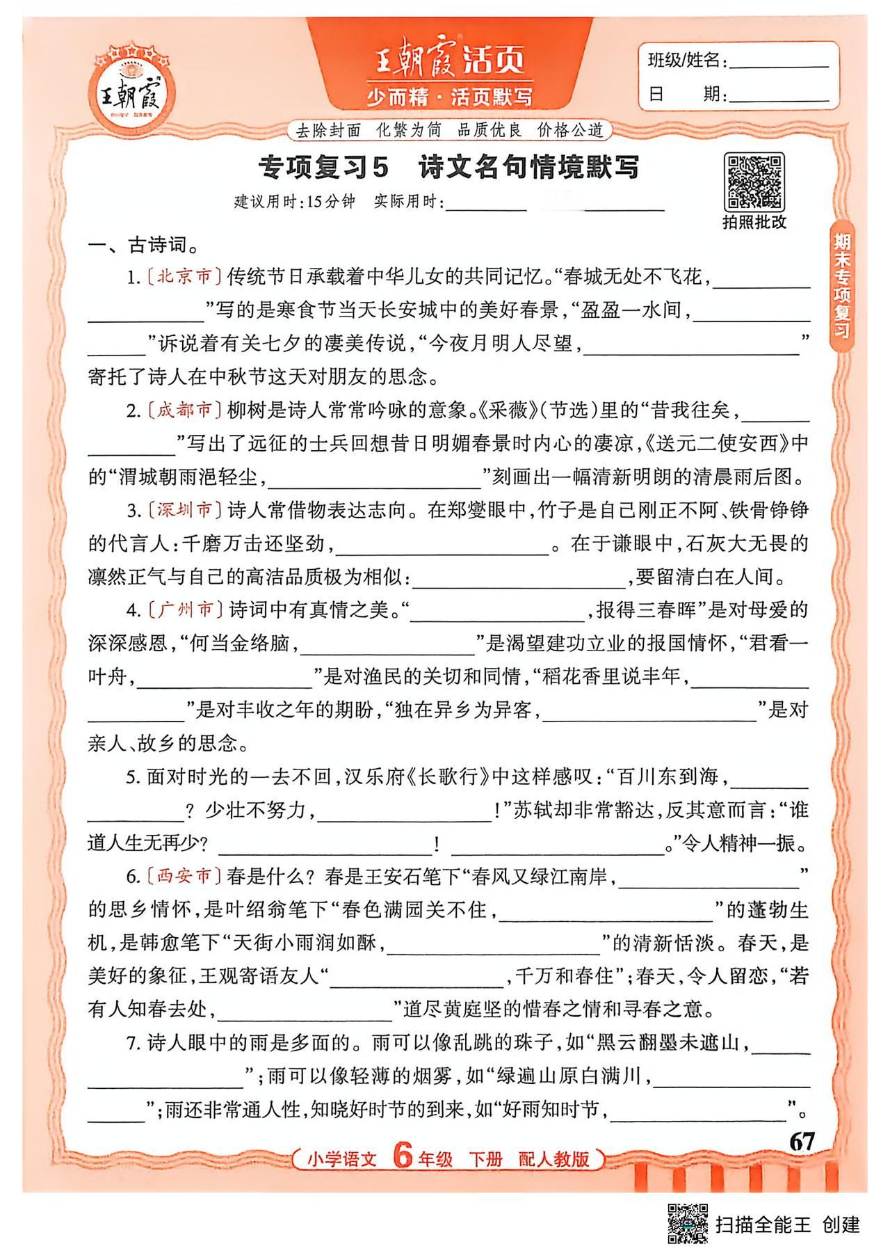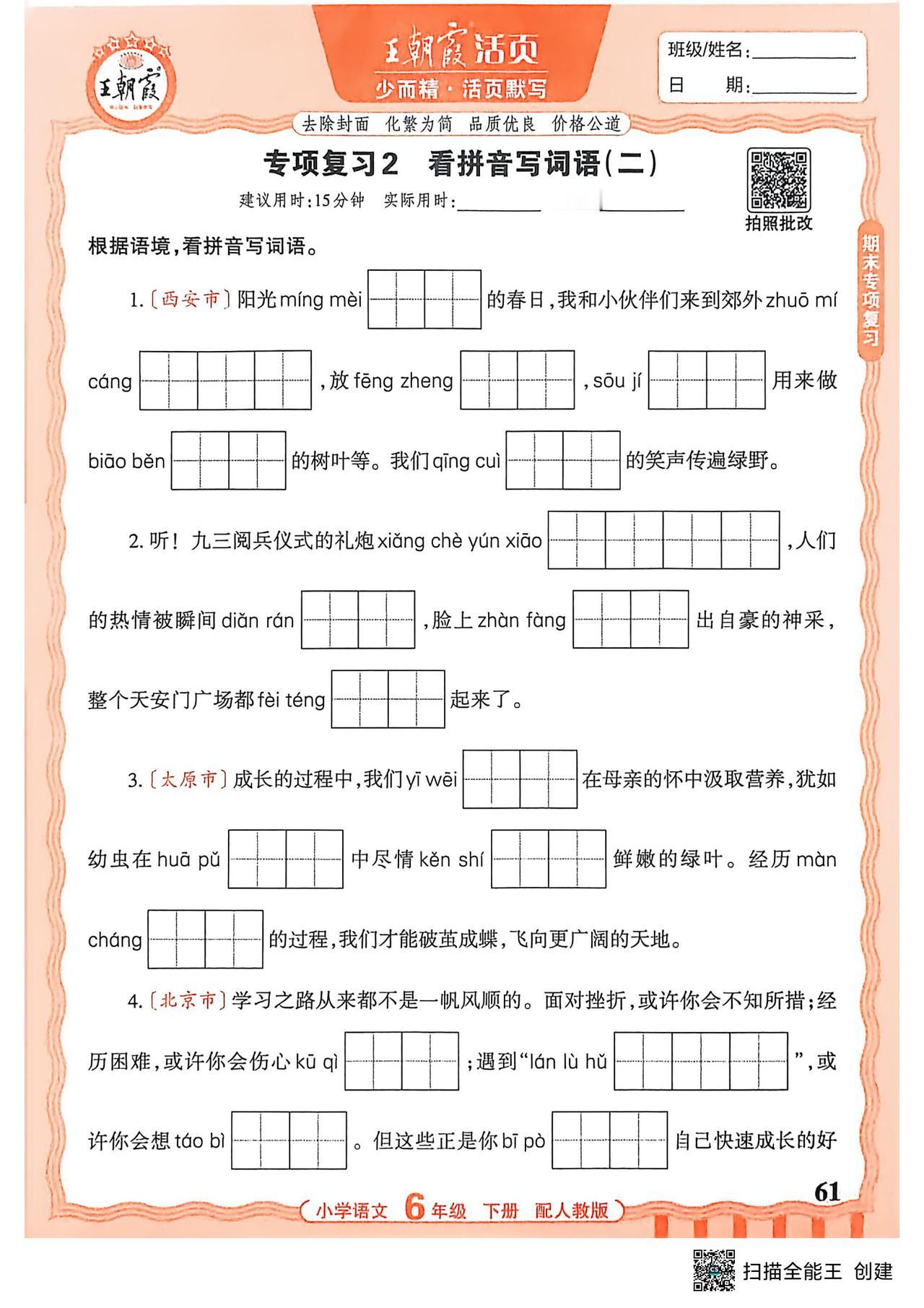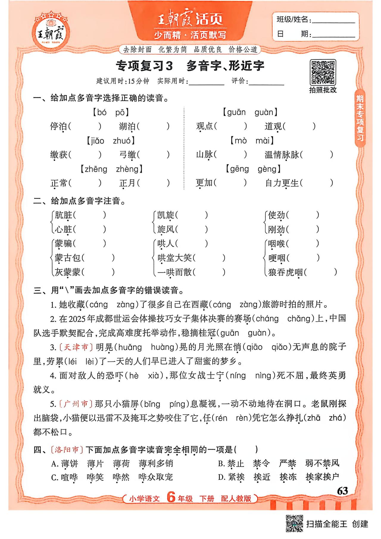 26春六年级下册语文,看拼音写词语、多音字、形近字、词语、诗文名句情境默写等期末专项复习+参考答案,收藏练一练巩固知识