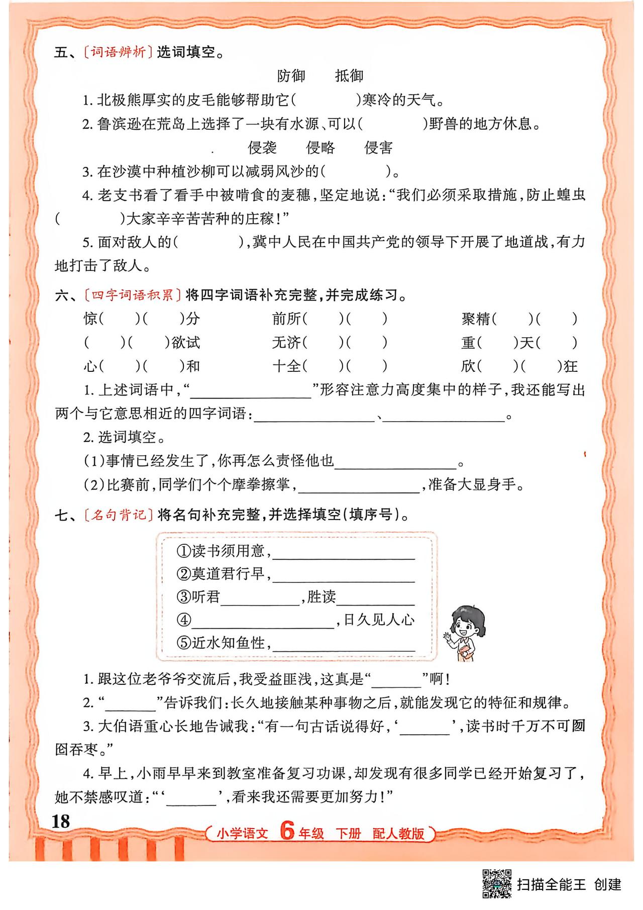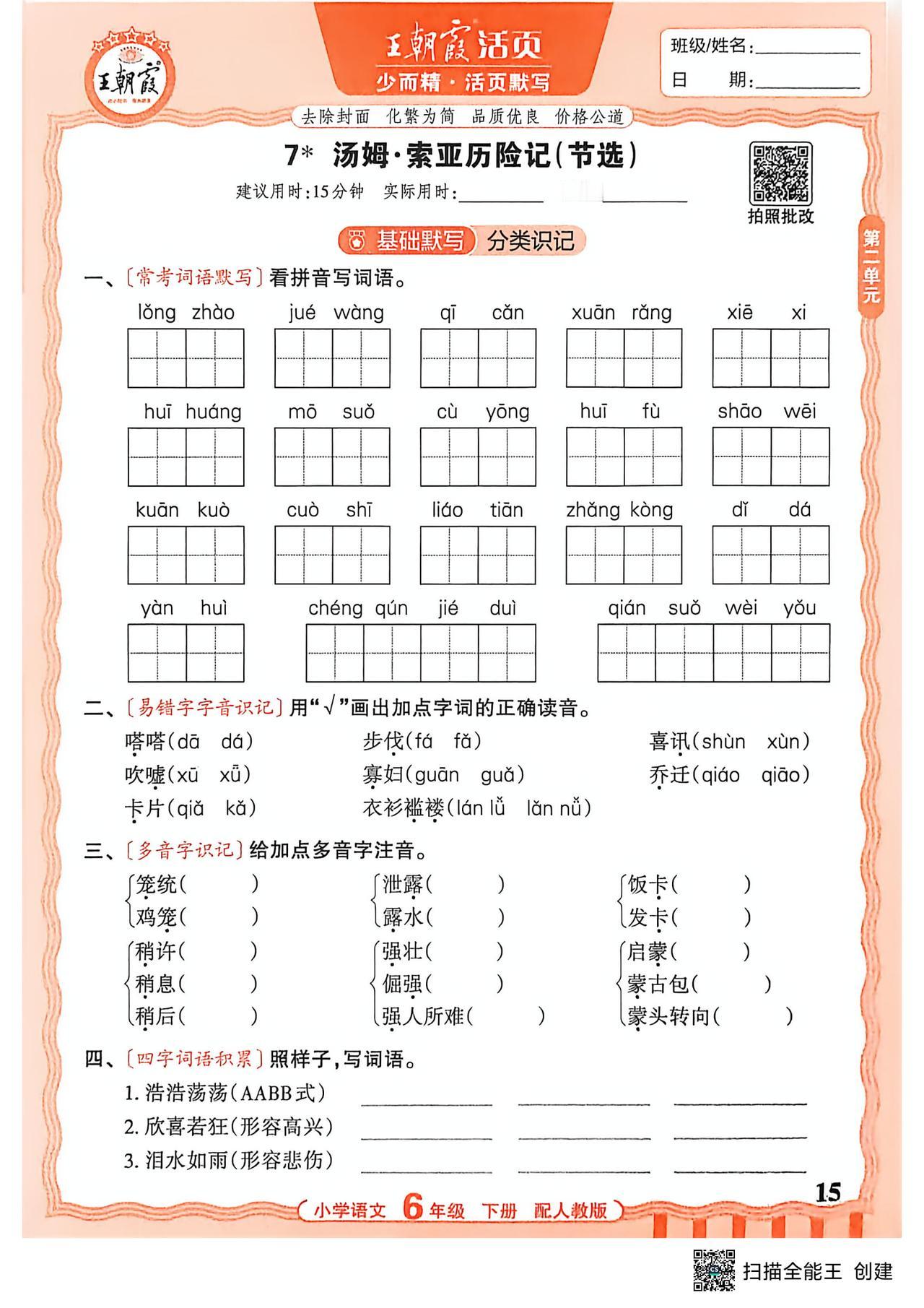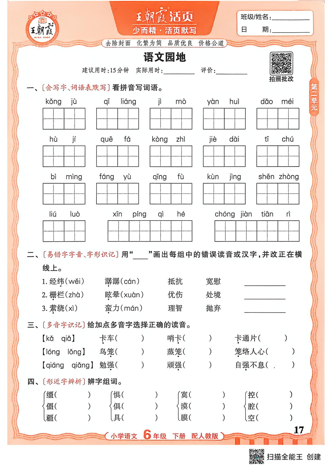 26春六年级下册语文,第二单元基础知识《活页默写》+参考答案,收藏练一练巩固知识