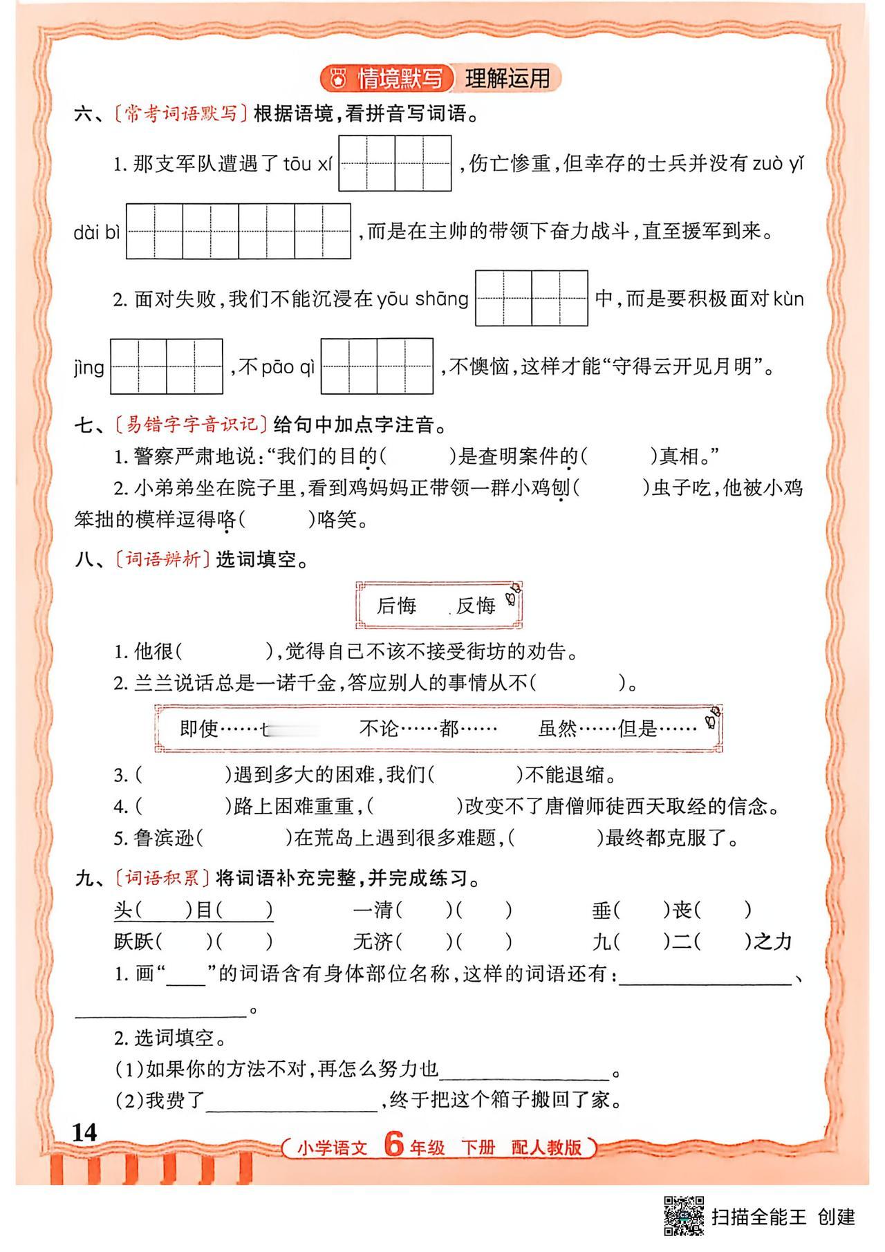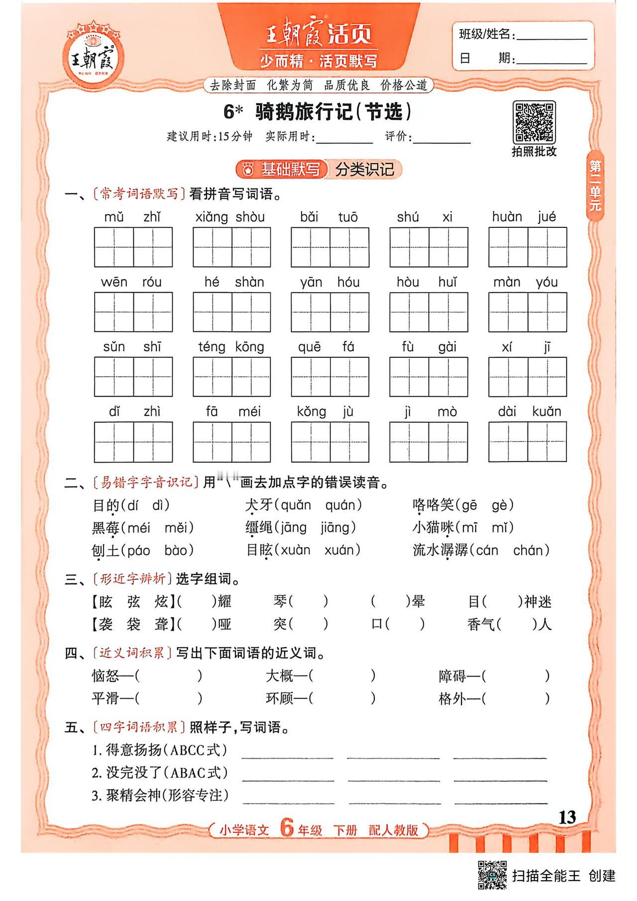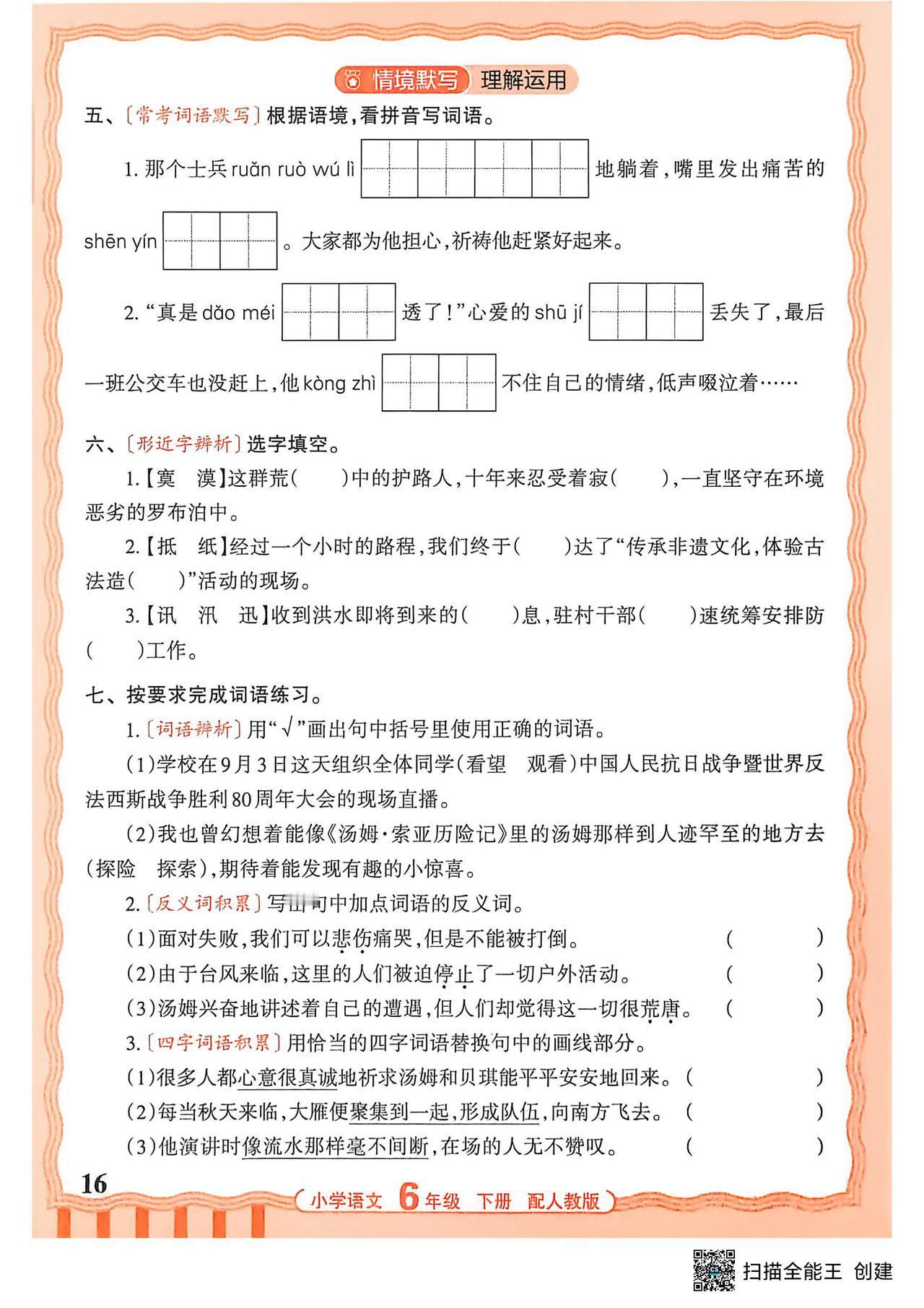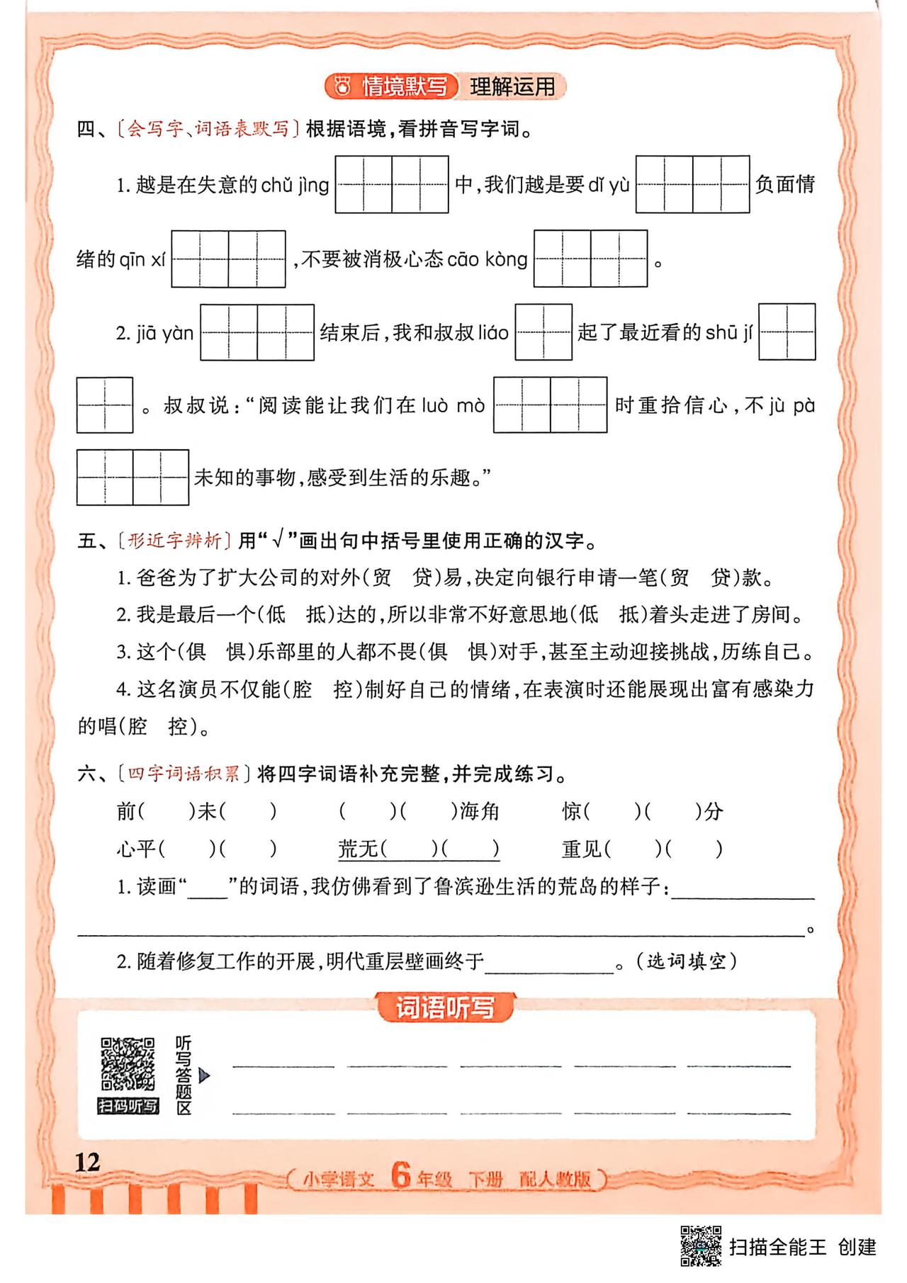 26春六年级下册语文,第二单元基础知识《活页默写》+参考答案,收藏练一练巩固知识