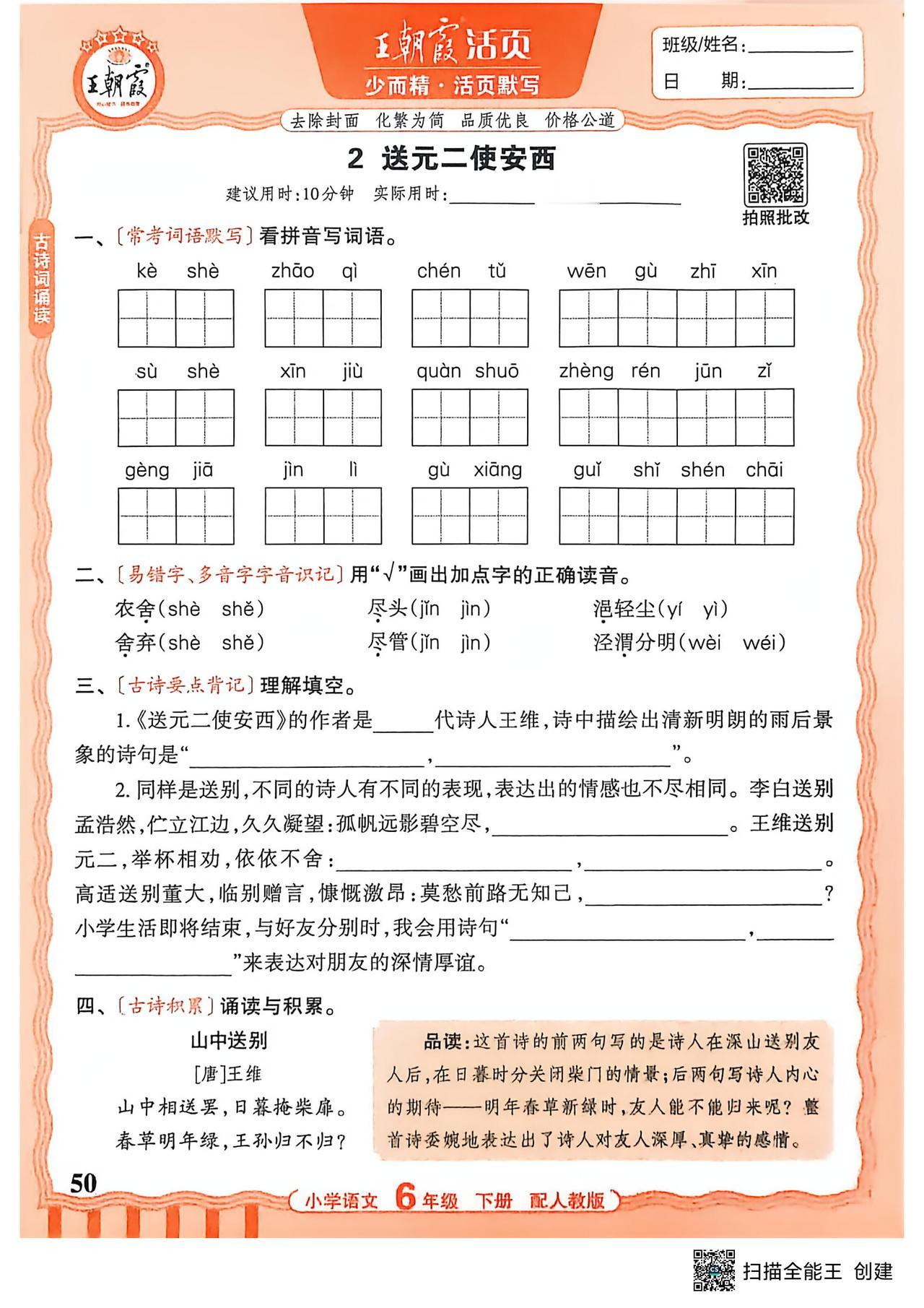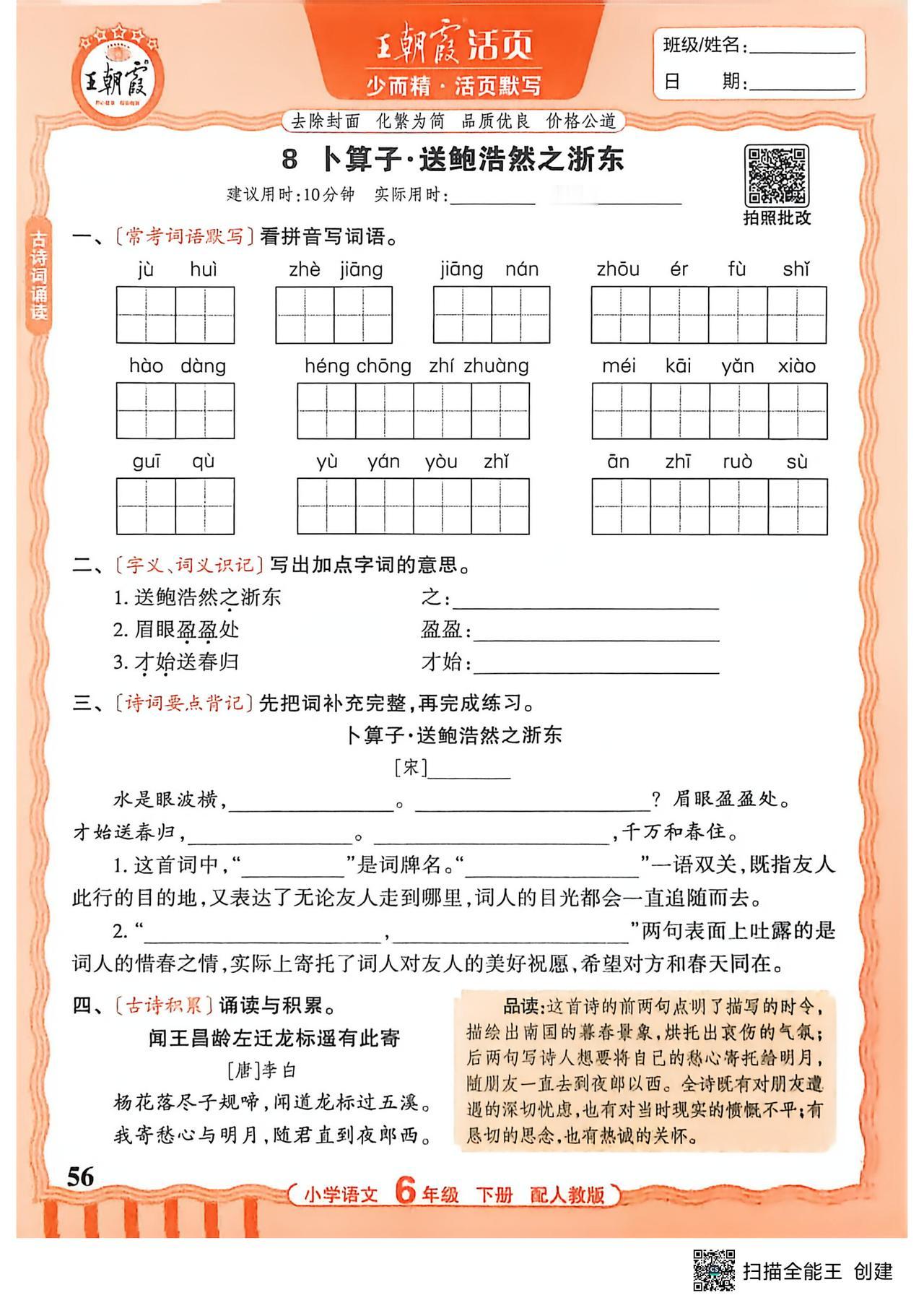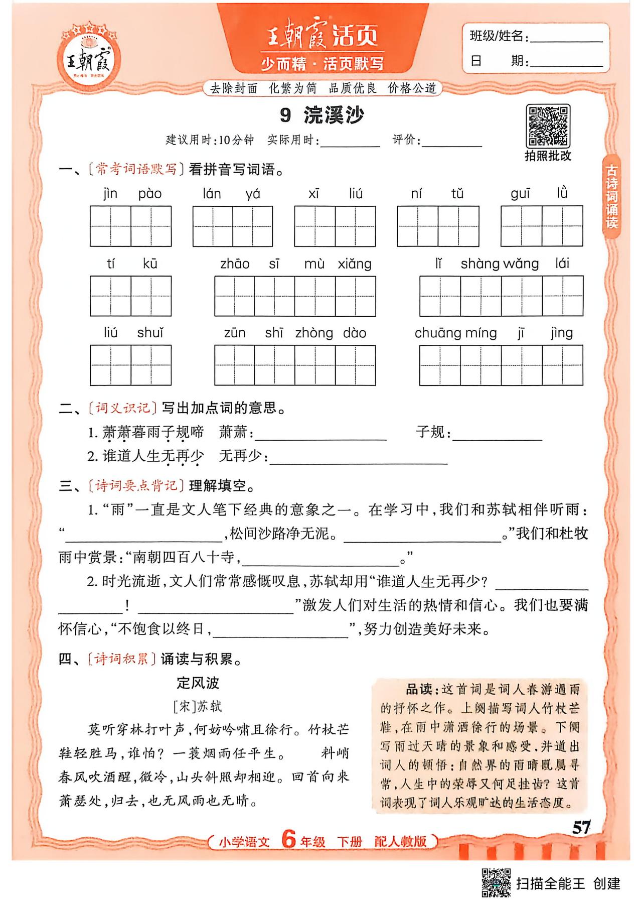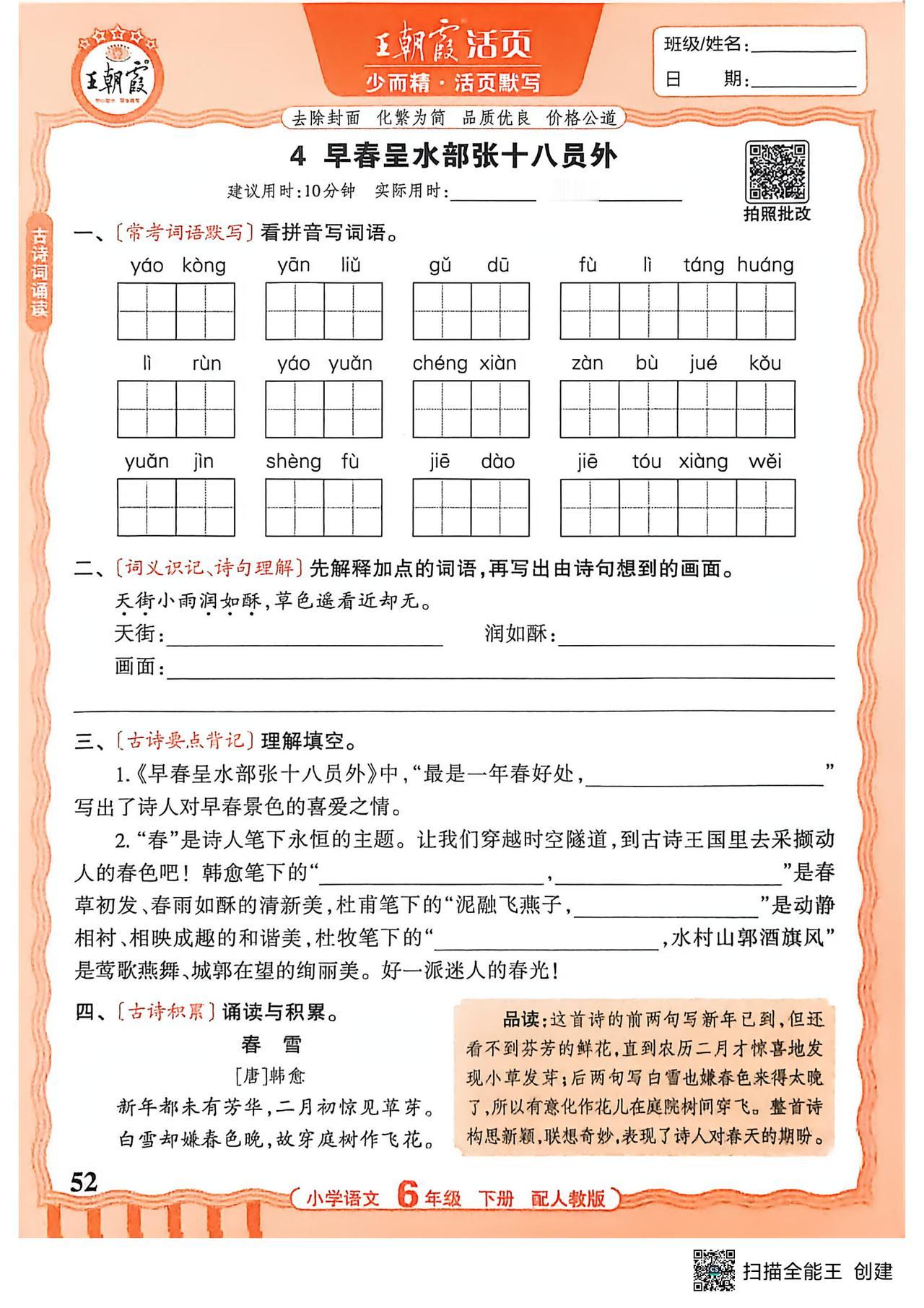 26春六年级下册语文,古诗词诵读基础知识《活页默写》+参考答案,收藏练一练巩固知
