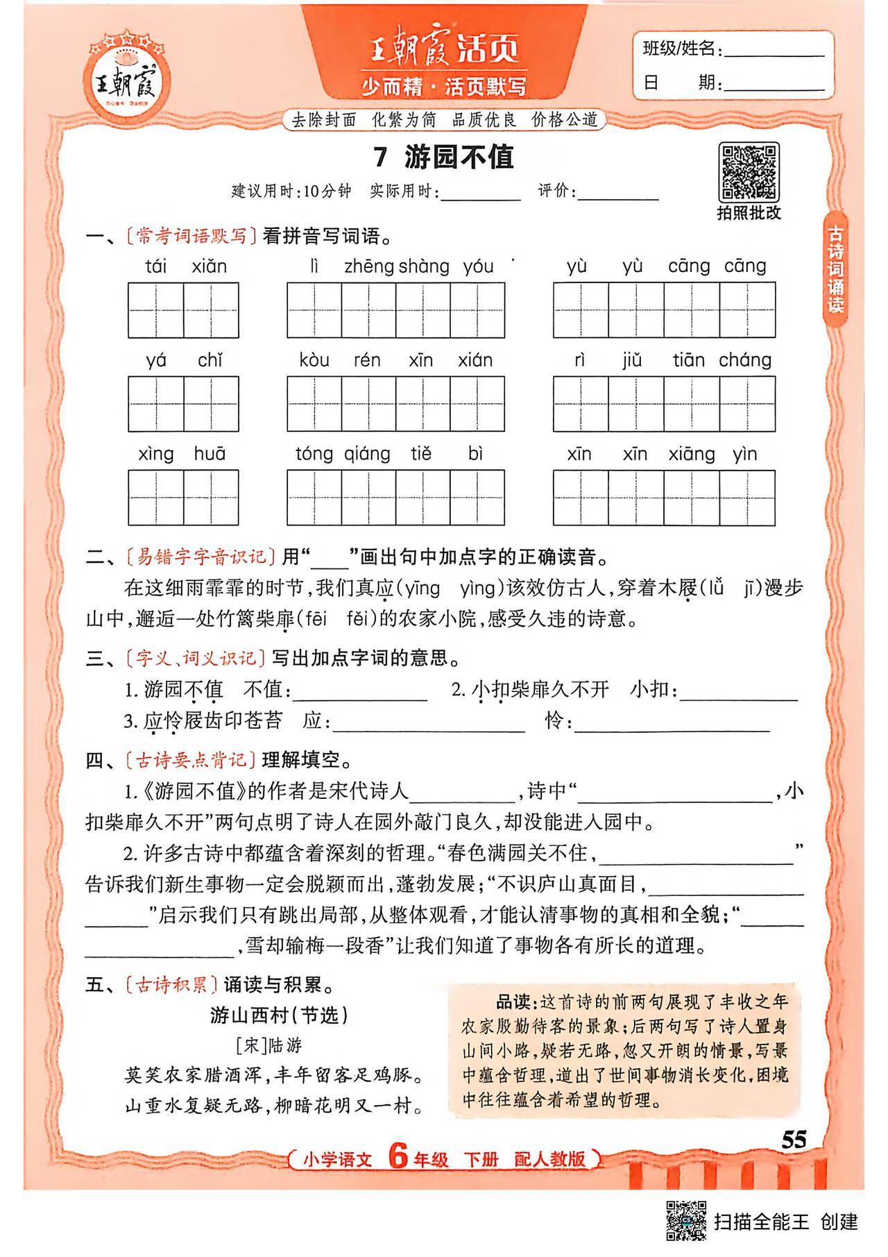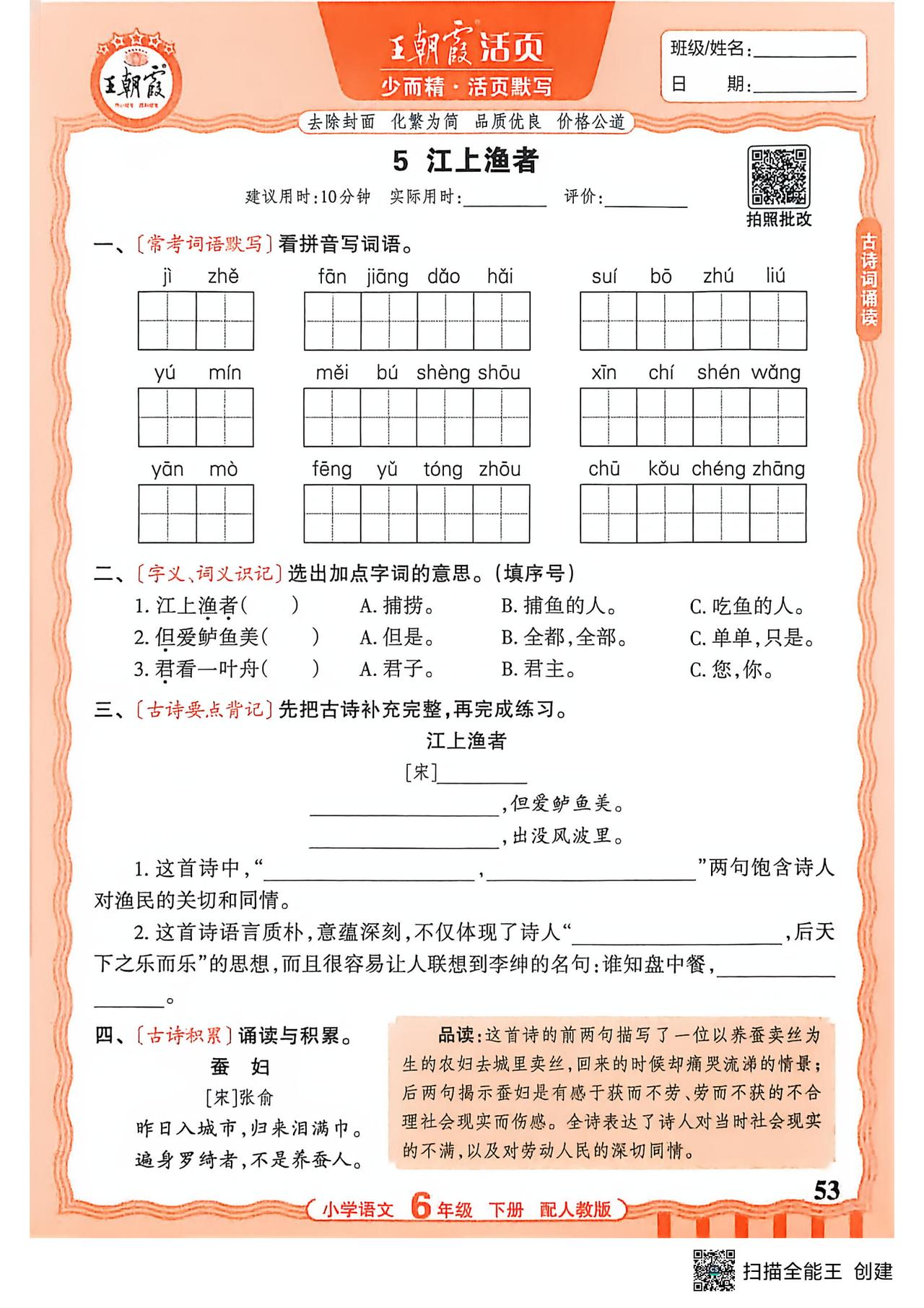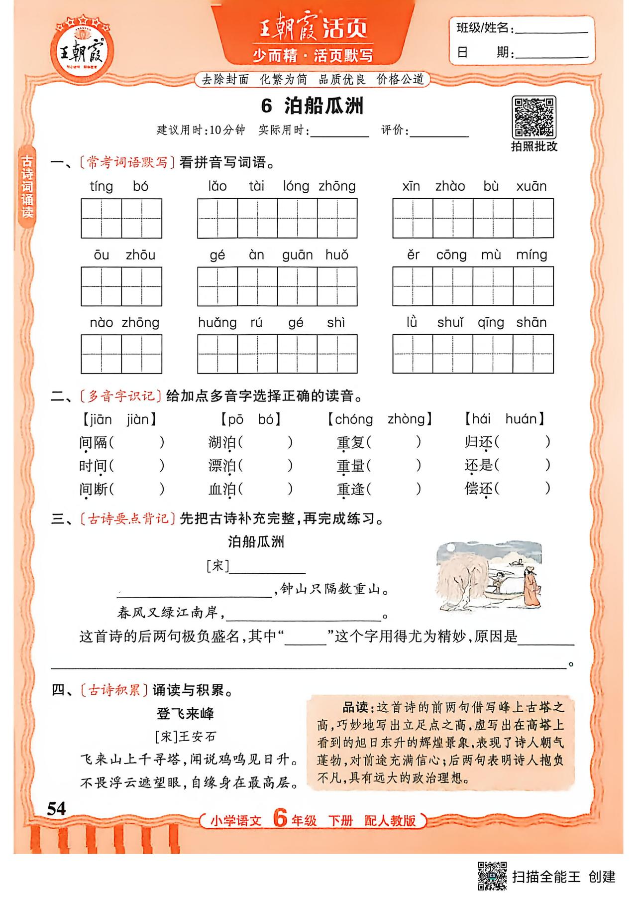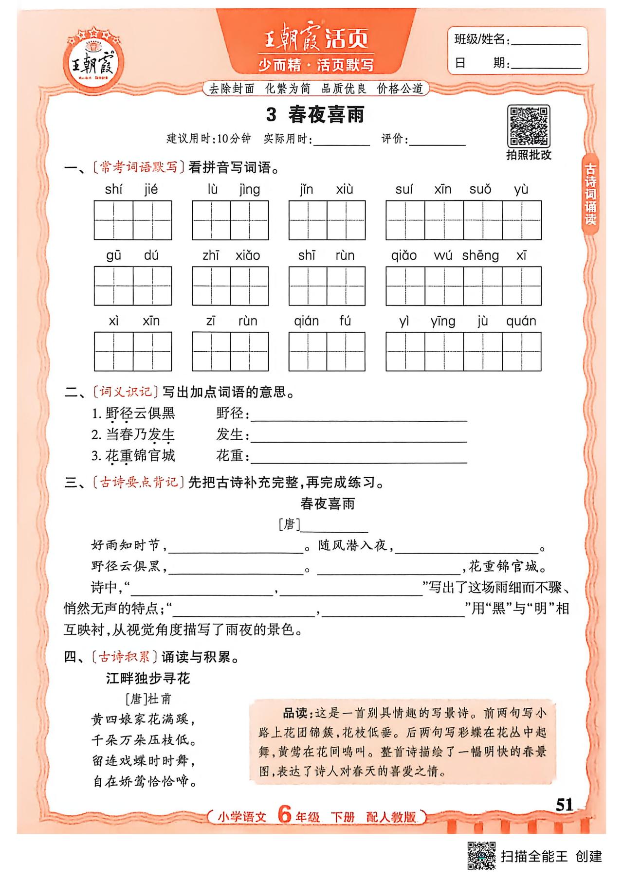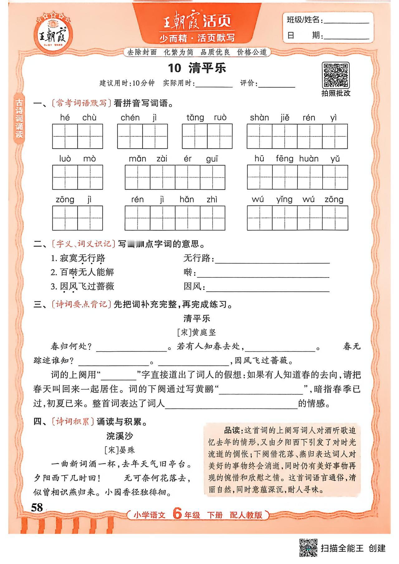 26春六年级下册语文,古诗词诵读基础知识《活页默写》+参考答案,收藏练一练巩固知