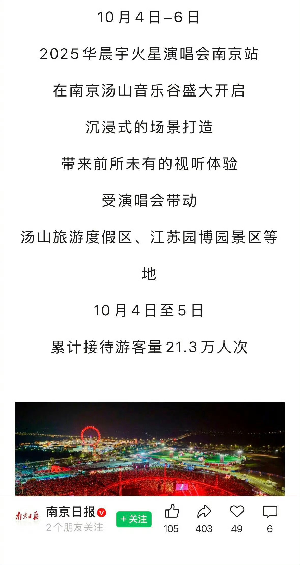 华晨宇曾2天带动南京汤山21万客流 华晨宇火星演唱会不仅是音乐盛宴,更带动了一个城市的旅游经济,汤山音乐谷三天连演,仅两日便涌入21.3万游客!影响力号召力太吓人了!