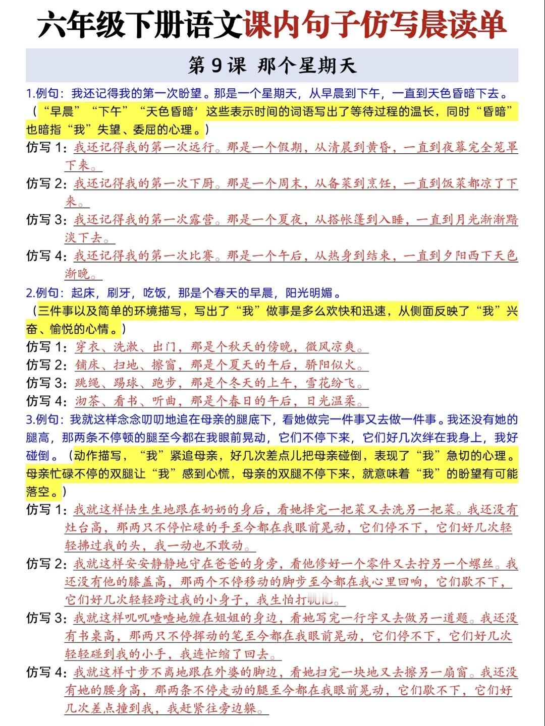 六年级下册语文,第三单元《匆匆》《那个星期天》课内句子仿写晨读单,收藏学习~六年