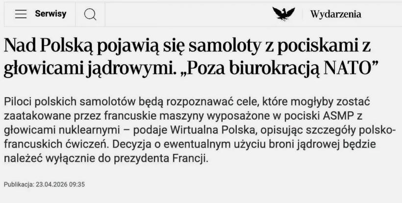 4月23日,波兰《共和报》大张旗鼓的表示:波兰和法国正在计划联合军事演习,但这次演练的不是常规攻防,而是直接模拟利用战机对俄罗斯和白俄罗斯发动战术核打击。更狂的是,演习地点就选在波罗的海上空和波兰北部,几乎是隔着边境线指着俄罗斯的鼻子在比划。