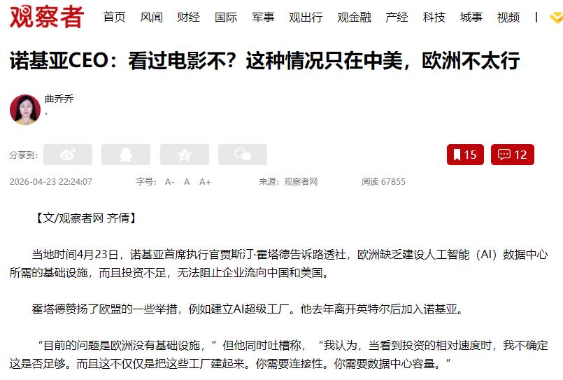 当地时间4月23日,诺基亚CEO贾斯汀·霍塔德接受路透社采访时,说了句大实话:欧洲搞AI的数据中心,基础设施不行,投资也跟不上,根本拦不住企业往中国和美国跑。