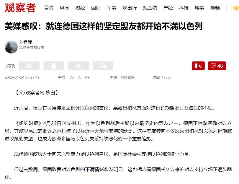 《纽约时报》之所以关注这事,就是因为德国太有代表性了,连最铁的盟友都批评它,可见以色列已经失去不少欧洲盟友的信任。