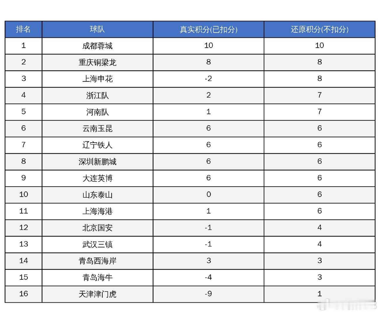 假设没有罚分这事,中超四轮会是什么样子?成都蓉城还是第一,排第二的是4轮8分的上