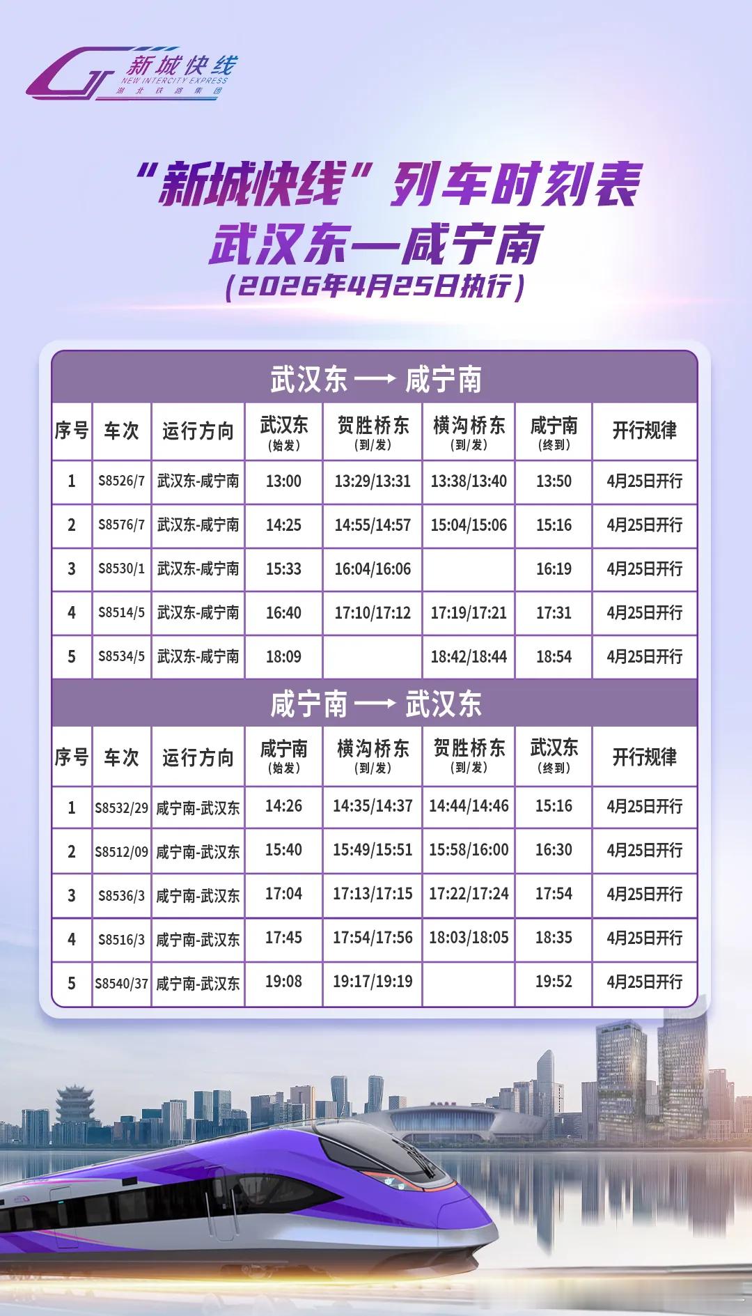 【武咸城际铁路 2026年4月25日武咸城际铁路“新城快线”列车开行公告】 2026年4月25日武汉至咸宁城际铁路公交化 “新城快线”开通运营,2026年4月25日武咸线“新城快线”列车开行时刻表如下:(湖北铁路集团轨道运营有限公司)