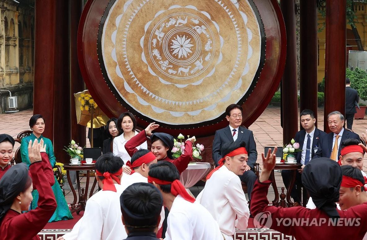 韩国总统与夫人金惠景在越南看演出!4月24日李在明出访越南最后一天,没有什么正式活动,看越南河内升龙皇城传统演出。