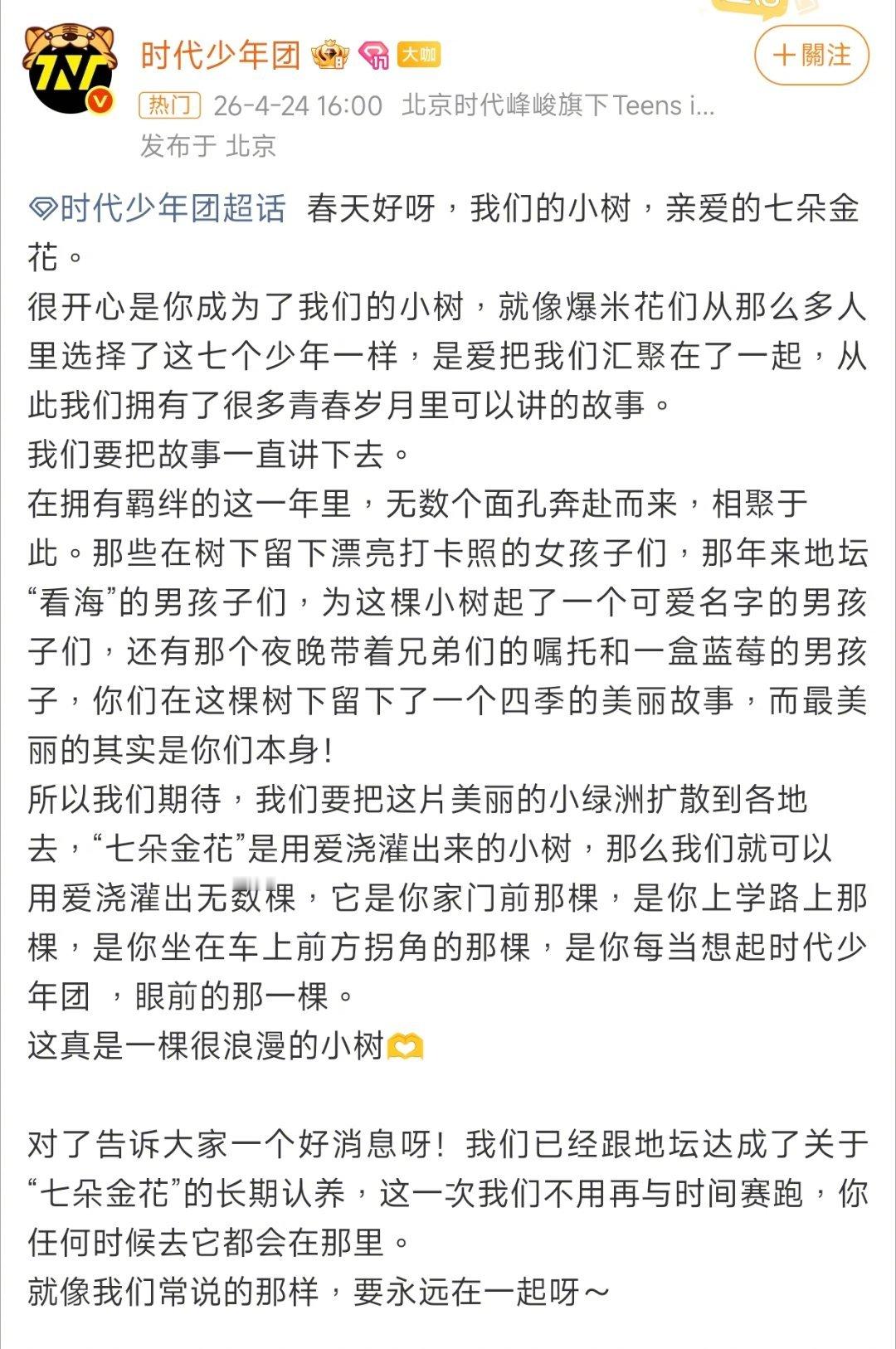 时代少年团长期认养七朵金花“七朵金花”从来都是被爱意好好守护的小树🌷时代少年团与地坛达成长期认养,这棵承载着心意的小树终于不用再和时间赛跑!友谊果然是最厉害的魔法