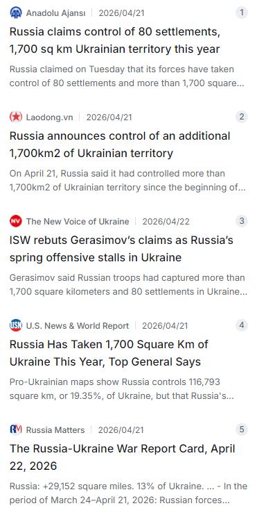 俄军在那之后调整了战术,不再贪多求快,改为用稳扎稳打的消耗战慢慢蚕食。到了2026年4月,俄军方称今年已控制80个居民点和超过1700平方公里土地。不过各方数据差异不小,有地图显示俄控面积约11.6万平方公里。推进速度也在变慢,2026年3月只推进了约133平方公里,日均15到70米,比一战索姆河战役还慢。这是俄军2024年6月以来单月推进最低值,土地是用人命和弹药一寸一寸堆出来的。