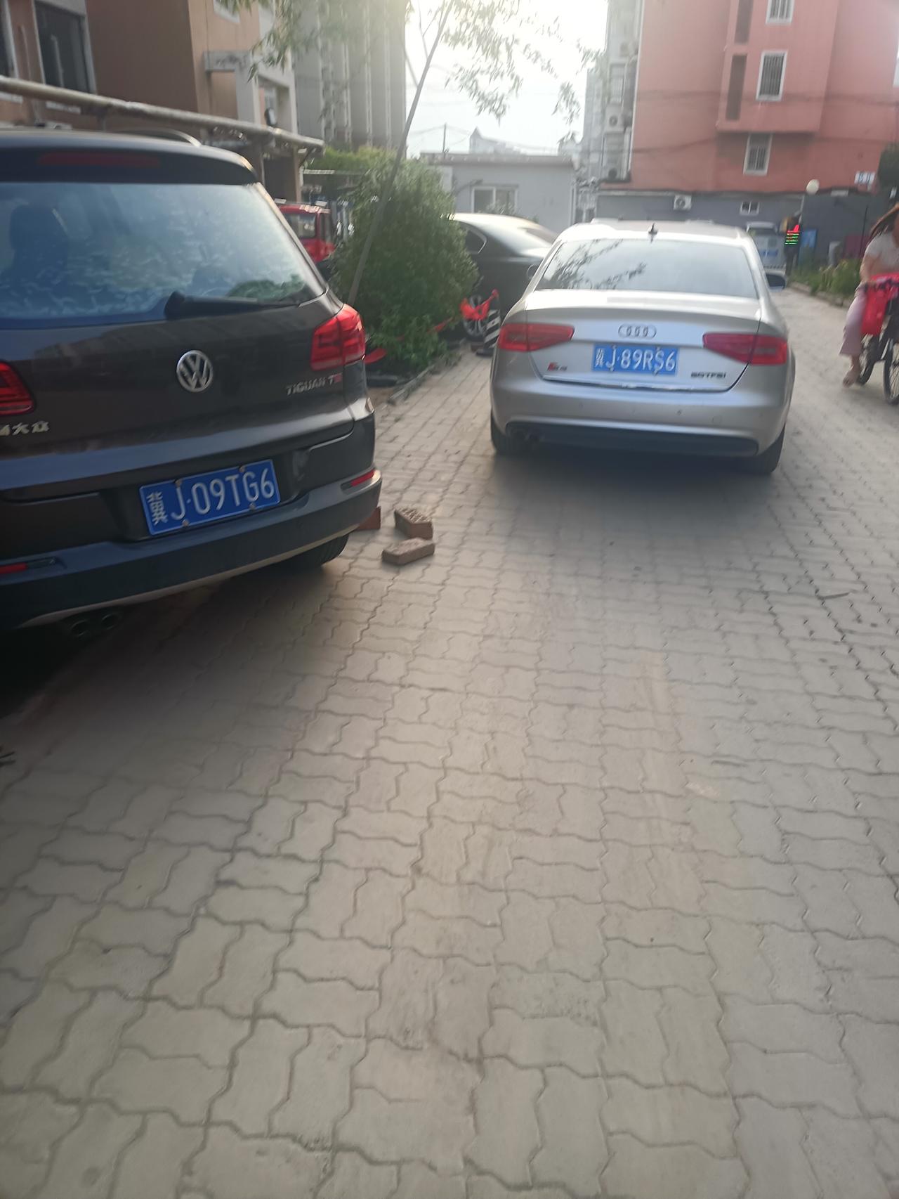 这辆灰色奥迪就这样停在小区出口处,占了一个车道,于是这条路变成了单行道。