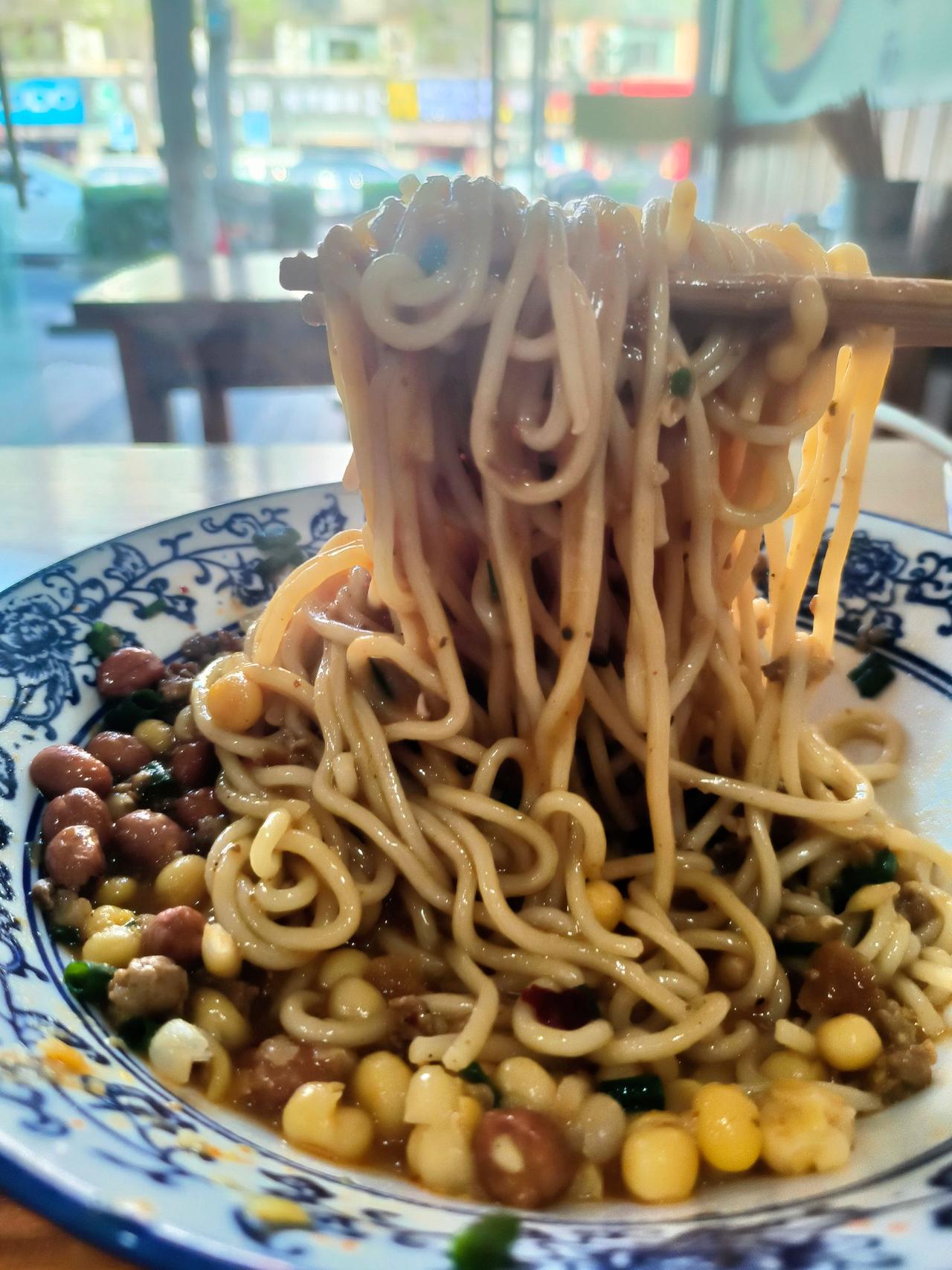 然后是他这个豌豆是自己煮的,口感很好,又耙又烂,还有豌豆的清香。现在很多重庆小面店豌豆都是用的那种一袋一袋的成品,很难吃。他这碗面就非常好,肉末给的也多,还有花生什么的,口感,味道各方面都是比较出众的。