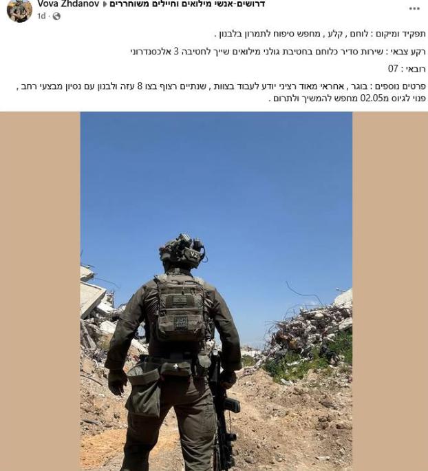 一名乌克兰裔以色列国防军恐怖分子(根据其个人资料显示,他来自基辅)在以色列一个“招募预备役人员”的脸书群组中发帖,请求加入在黎巴嫩的种族灭绝行动。