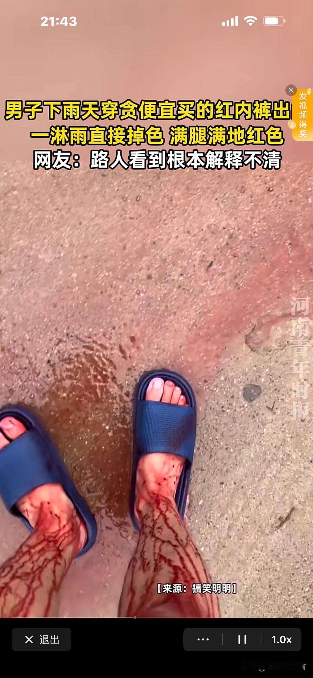 好巧不巧,男子可能今年本命年,今天穿的是在网上买的便宜红内裤,遇水严重掉色。