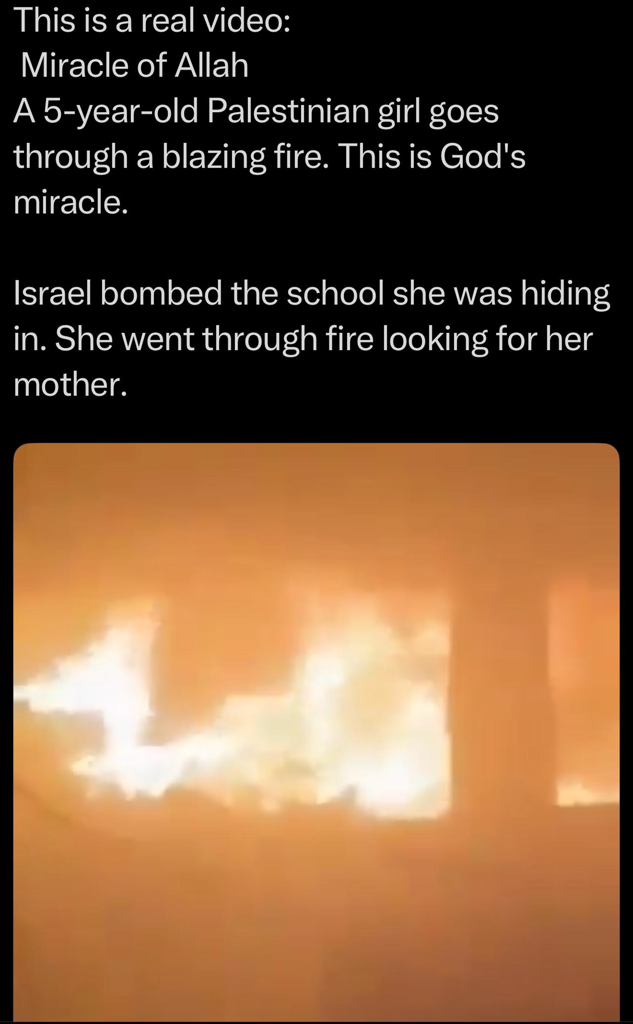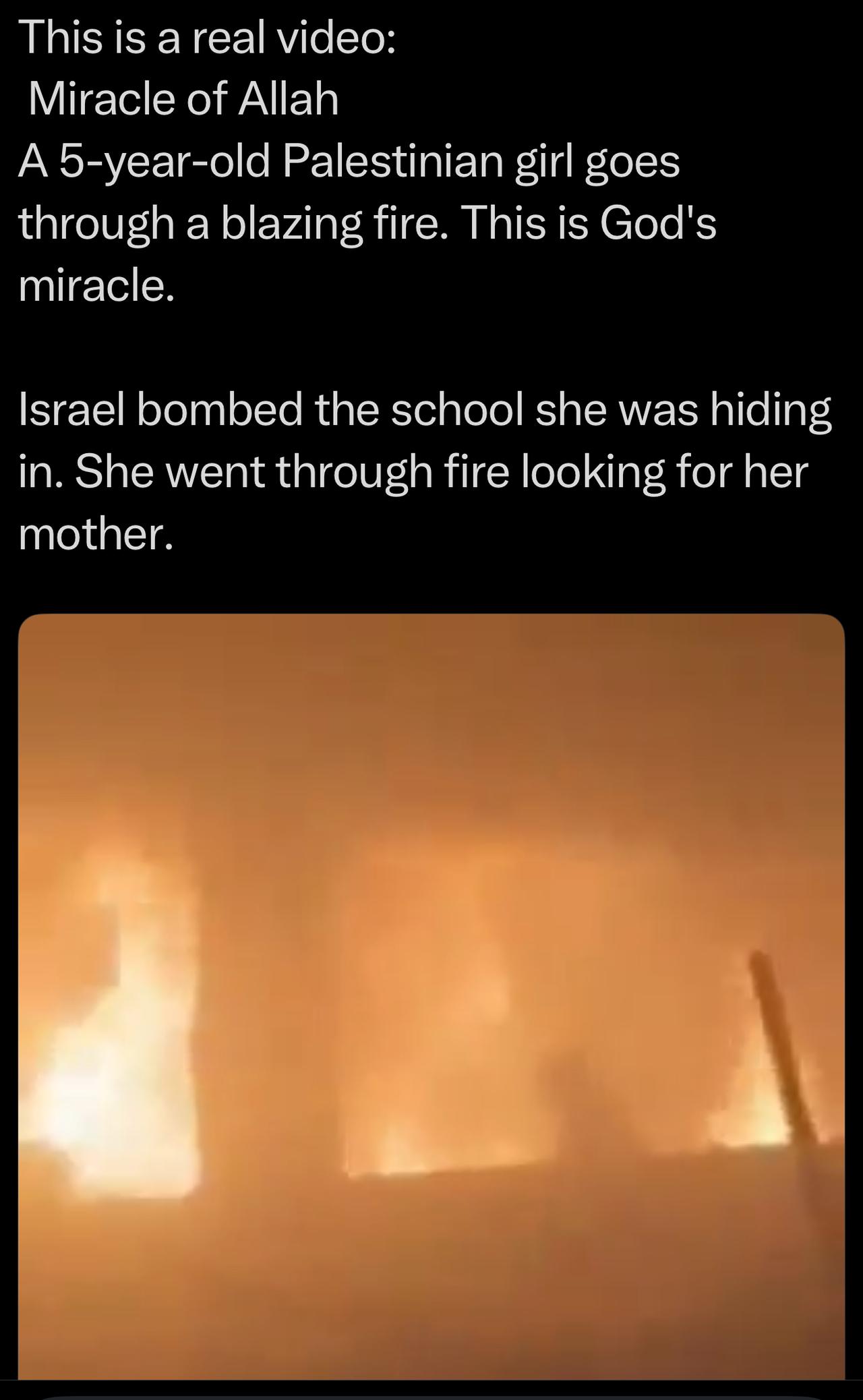 整个中东世界正在传播的视频,一名5岁的巴勒斯坦女孩,穿过熊熊大火,她在大火中奇迹生还,去寻找自己的妈妈,以色列人炸毁了她藏身的学校,她却在大火燃烧的房子里站起来,去寻找自己的妈妈,当下,中东世界认为,这是上帝给的奇迹!这个视频感动了中东世界,处于苦难中的巴勒斯坦人,让很多人心痛!