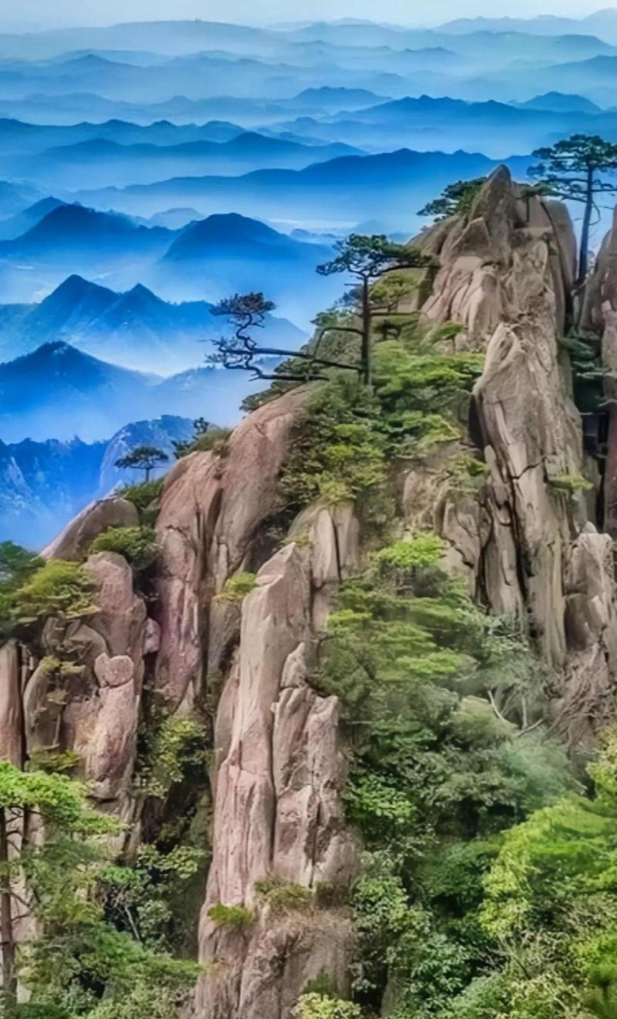 云雾漫过山脊之时群峰若隐若现,苍松扎根石缝傲然挺立。