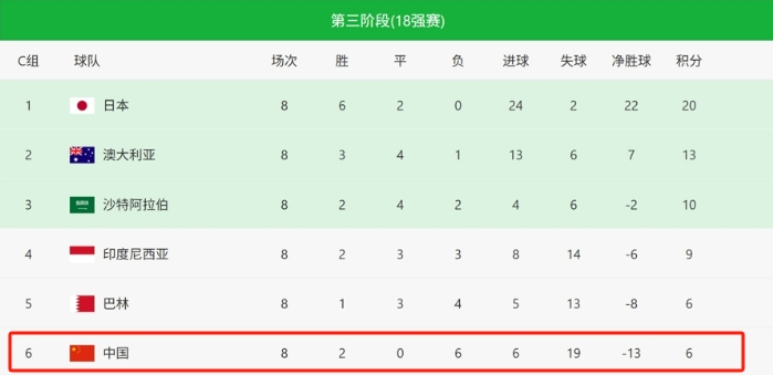 对于国足和伊万主帅而言,这场比赛不能接受输球,因为按照晋级规则,每个小组前两名可直接晋级世界杯决赛圈,第三和第四将获得参加附加赛资格。而目前国足所在的C组排名小组垫底,头名的日本队提前出线、第二的澳大利亚队也基本上收下另外一个出线名额。