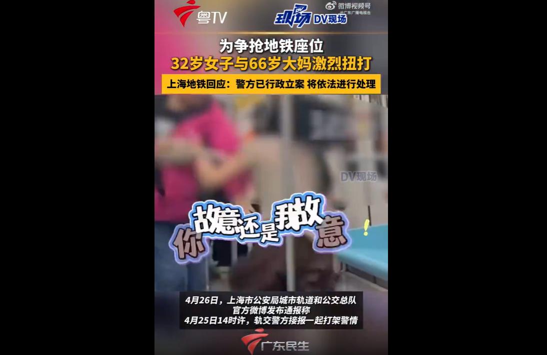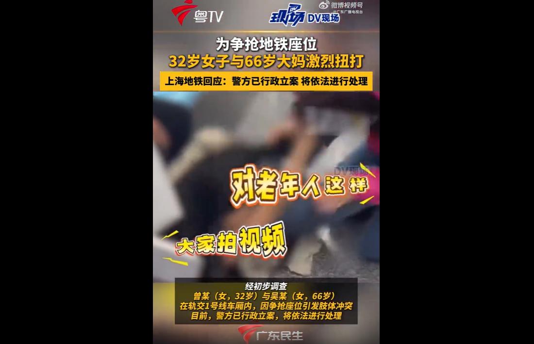 4月25日下午,上海地铁1号线上,32岁女子曾某与66岁老人吴某因争抢一个座位,引发激烈肢体冲突,场面一度失控,两人互相薅头发、扯衣服,甚至打到车厢门边,惊动轨交警方。