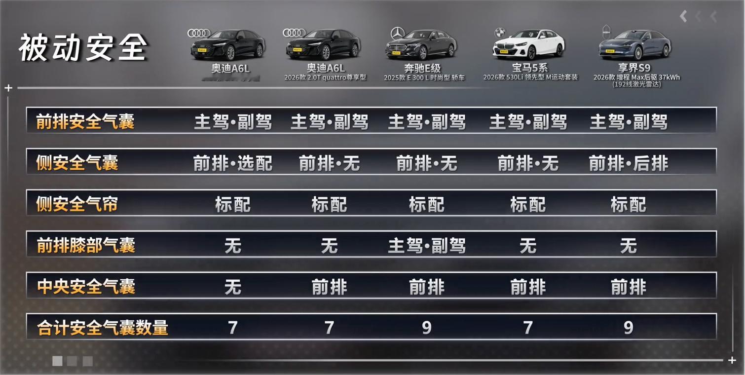 先看麋鹿,奥迪A6L quattro直接跑出80.5km/h的全场最高成绩,比两驱版的78.4km/h高出了2km/h,能明显感觉到四驱系统在紧急变线时的抓地优势,车身姿态稳得很。奔驰E级78.2km/h的成绩比宝马5系(77.5km/h)还要高一点,说明它的底盘调校比大家印象里的更灵活。最有意思的是享界S9,全场最重的车,却和宝马5系跑出了一样的77.5km/h,靠的就是纯电平台的低重心和电控系统,把自重劣势给扳回来了。绕桩环节的差距更直观,奥迪A6L quattro以9.72秒的断层式成绩领跑,平均车速直接拉到60km/h,比第二名奔驰E级的10.06秒快了近0.4秒,四驱在连续重心转移里的牵引力优势一目了然。享界S9和宝马5系的成绩几乎一样,10.43秒对10.42秒,说明它的车身跟随性和侧倾控制都很稳,完全没有大家担心的“大车不好开”的问题。最能拉开差距的是AEB主动刹车,享界S9直接把成绩干到了120km/h,是全场唯一能在这个时速下稳稳刹停的车型。奔驰E级110km/h、奥迪A6L两款都是100km/h,而宝马5系的极限只有90km/h,能明显看出各家的安全标定思路不一样:享界S9更激进,BBA则更偏向保守,但都能覆盖日常通勤的需求。最后是100-0km/h制动距离,奥迪A6L quattro以33.99米的成绩拿下第一,两驱版34.77米紧随其后,享界S9 35.41米、宝马5系36.47米、奔驰E级37.96米,能看出奥迪的制动调校确实很扎实,即便是关闭ESP,也能给出很强的制动力。其实35万级的豪华轿车,每台车型定位不同,都靠着自身技术调校,在各项对比里发挥出专属优势。奥迪胜在操控和制动,享界S9赢在主动安全,BBA也各有成熟的调校功底。结合自己的用车场景去选,才是最靠谱的。