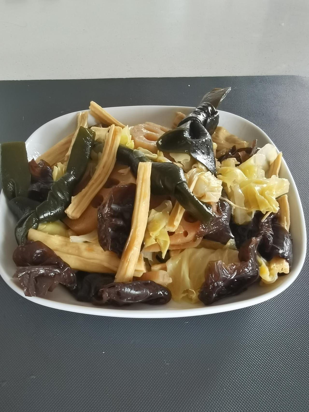 冰箱里还剩一点点包心菜,早上在买菜平台买鲜花时,顺手看到有莲藕海带凉拌菜,就买了一盒。回来把家里剩的包心菜、再泡一点黑木耳,跟莲藕、海带、腐竹拼在一起,凑成一盘。