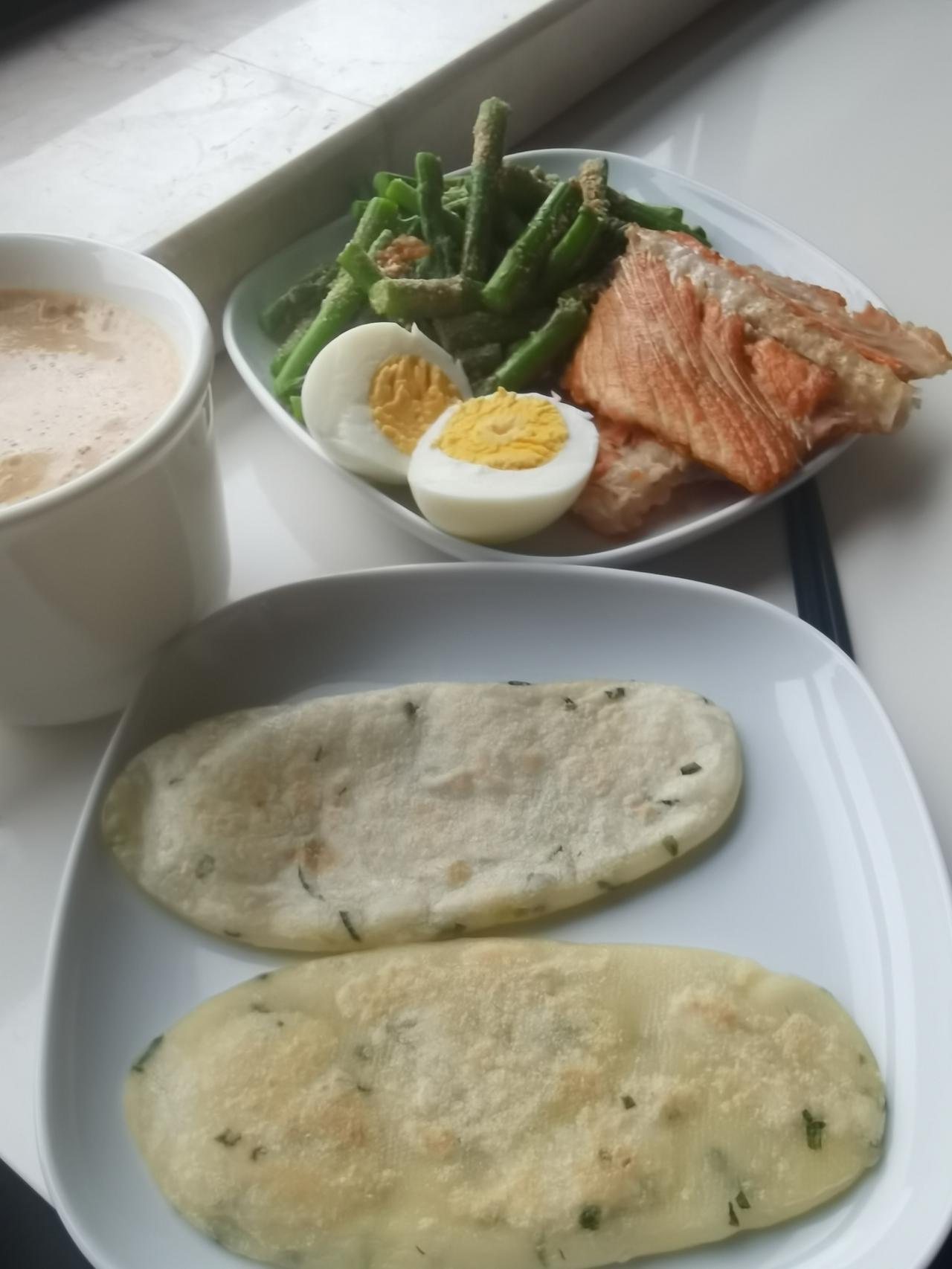 芦笋脆嫩,三文鱼骨煎得焦香,白煮蛋刚刚好,两片葱油年糕软糯。咖啡兑上牛奶,醇厚顺滑。简单又认真。