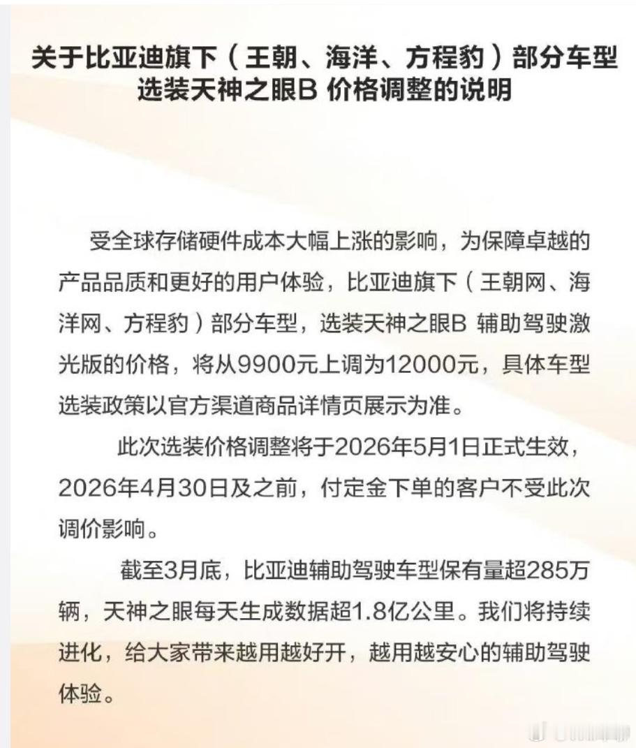 比亚迪率先涨价 比亚迪天神之眼 B 涨价 2100 元