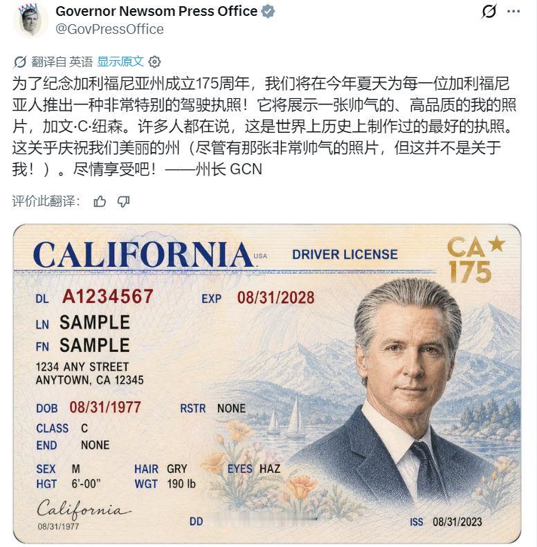 其后,加州州长纽森在社交媒体上模仿特朗普的口吻称,为庆祝加州175周年,将推出印有他自己“英俊照片”的“特别版驾照”。