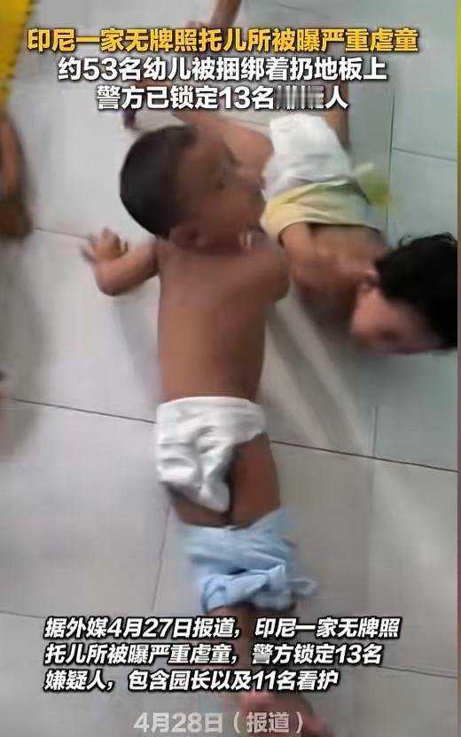 4 月 28 日报道,印尼曝出令人发指的虐童丑闻!一家无牌照的托儿所里,约 53 名幼童被捆绑着扔在冰冷的地板上,目前警方已经锁定了 13 名嫌疑人。