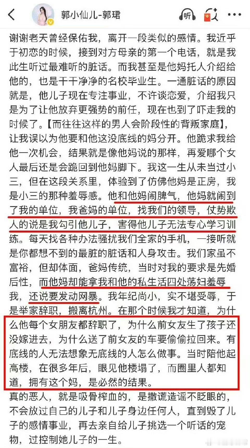 孙杨 郭珺亲妈当“正房”手撕儿媳,把姑娘家逼到辞职搬家。这边让前女友抱着别墅带孩子,那边让现任在综艺上当受气包。郭珺真是捡回一条命,嫁进去怕不是天天跪祠堂。
