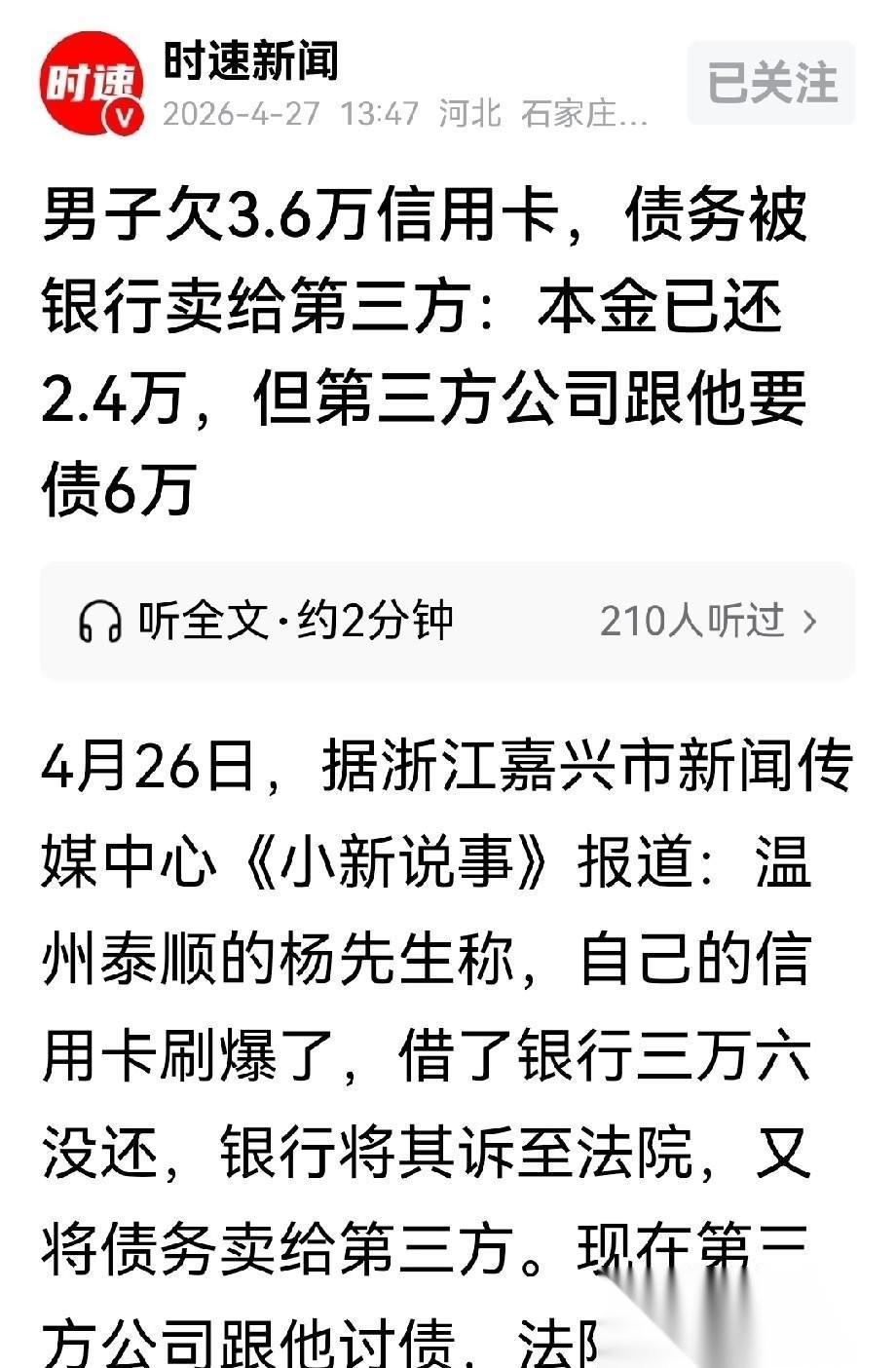 比高利贷还黑?浙江温州,男子因遇到了难处,欠了银行36000元,每月还1500,已经还了24000的本金,只剩下尾款待缴。本来以为马上就能结清账目了,结果借款平台为了甩掉呆账,连个招呼都没打,悄悄把这笔债转手卖给了第三方。