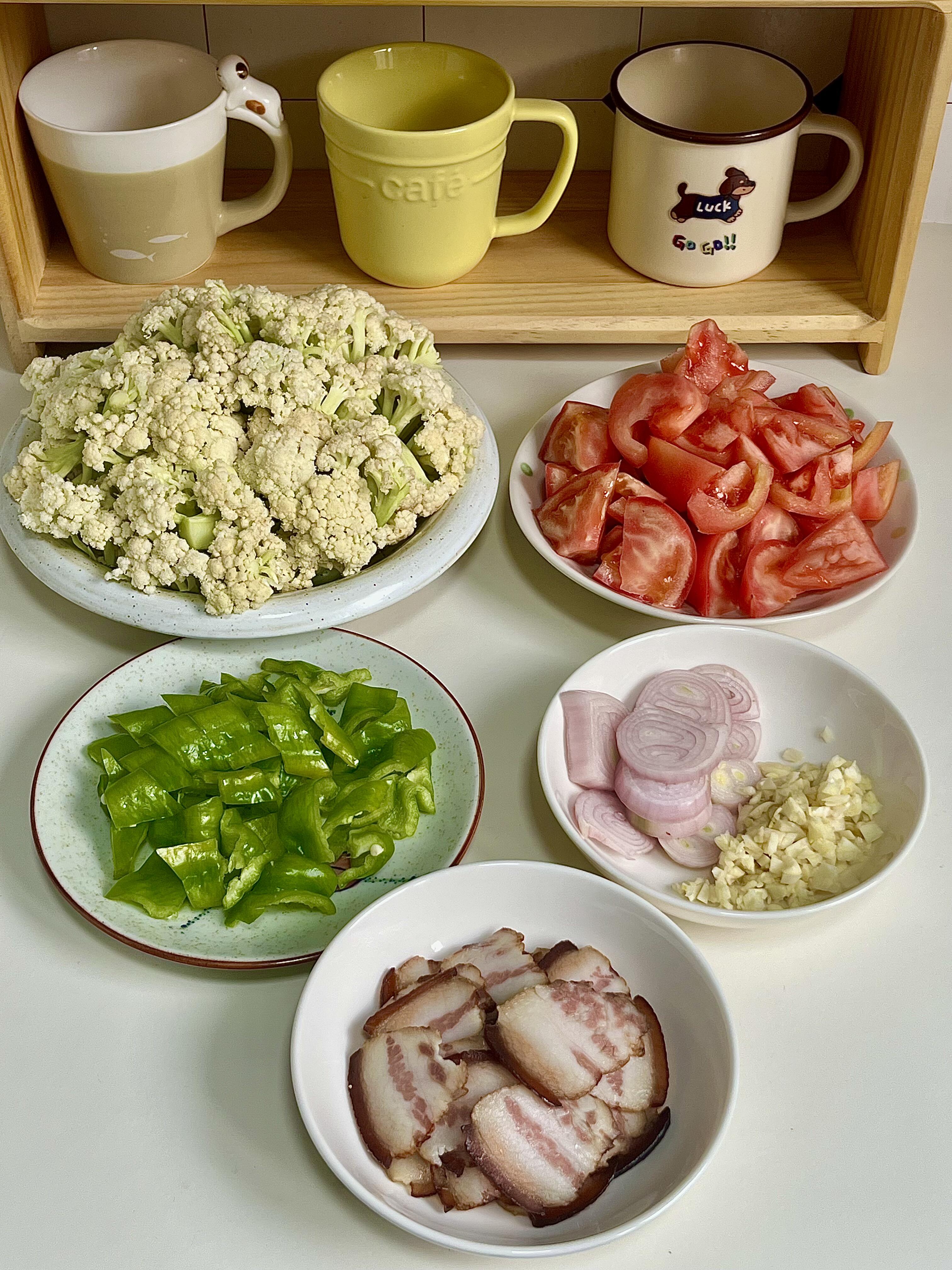 1. 花菜切成均匀的小朵,用清水冲洗干净备用;腊肉切成薄片,番茄去蒂切小块,螺丝椒切成小块,再切一些毛葱和蒜末,食材就准备好啦。