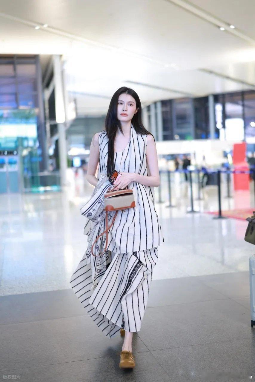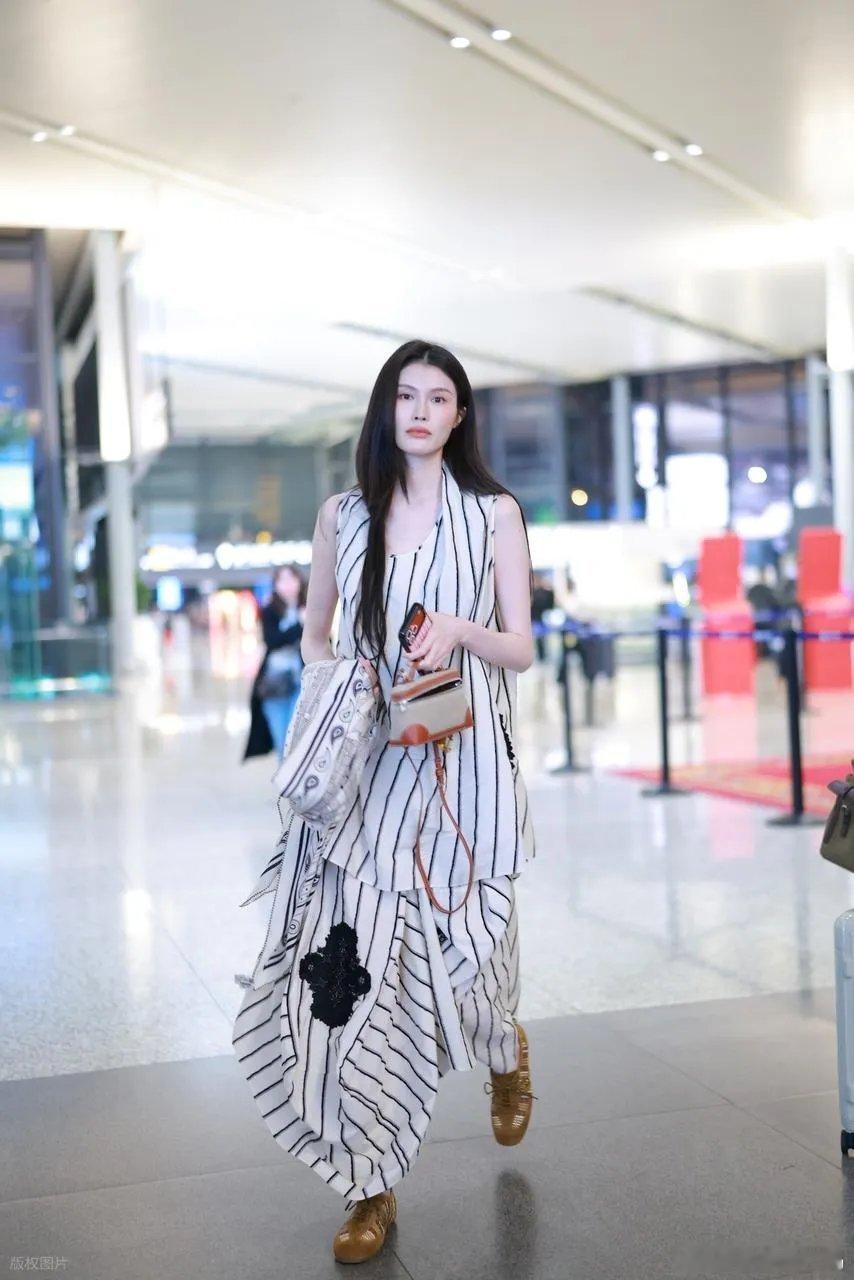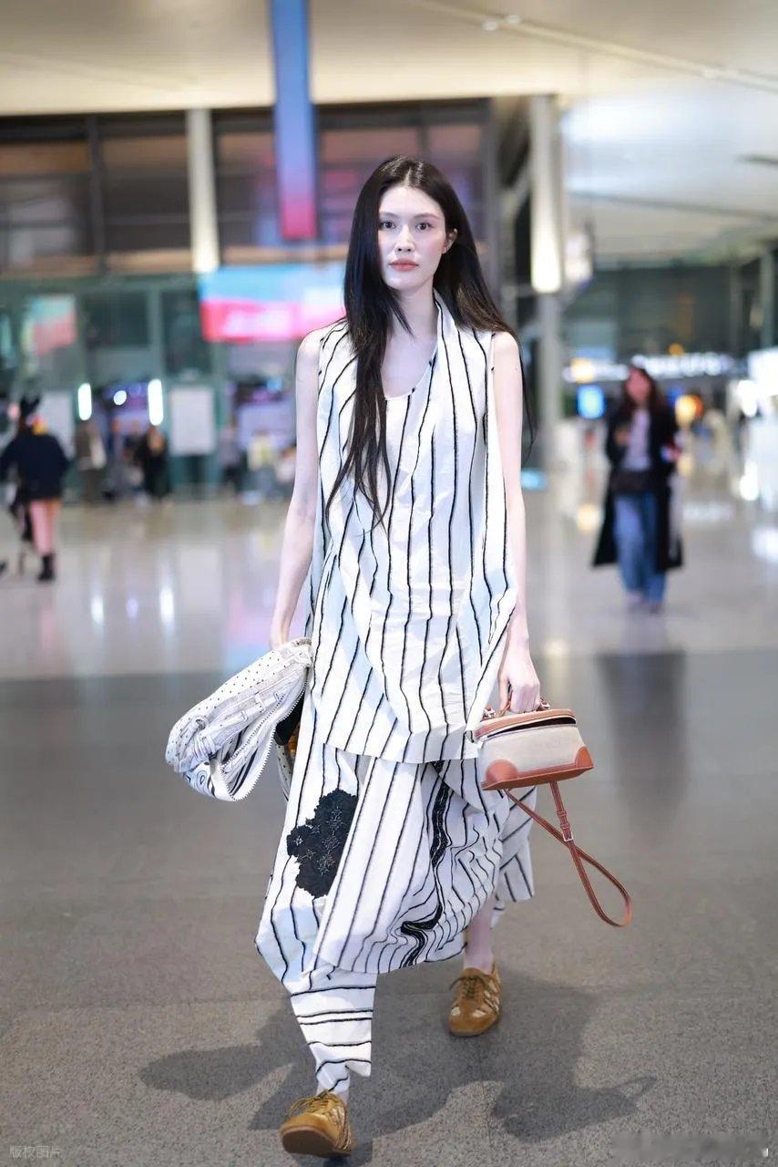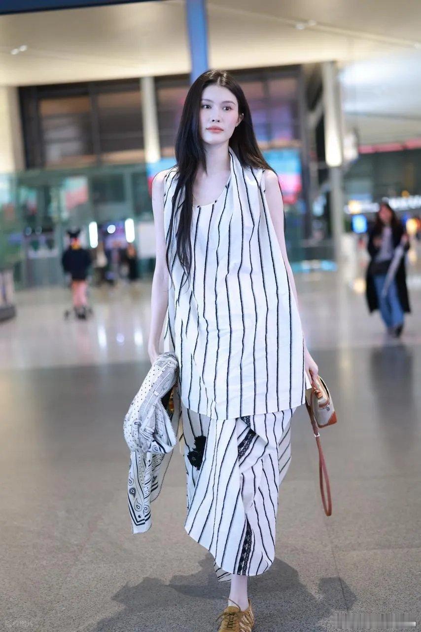 何穗机场随性出行,松弛感拉满!一身宽松穿搭慵懒潇洒,超模气质格外出众条纹吊带搭配