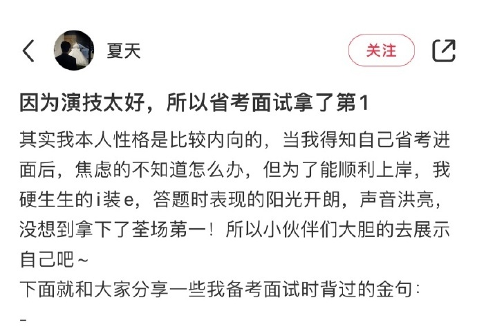 因为演技太好,所以省考面试拿了第一名