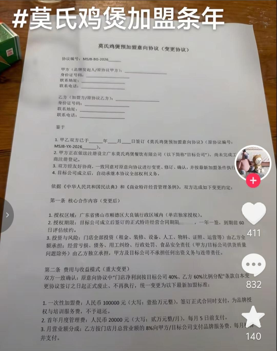 加盟莫氏鸡煲的费用非常高,加盟费10万,每月管理费2万,店铺总利润要4成上交。每月不管是否盈亏,都要上交营业额8%。