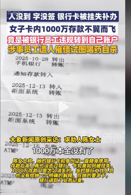 银行流水显示,2025 年 12 月 13 日,有人在陈某本人完全不知情、也没有任何书面授权的情况下,仅凭她的身份证复印件,就伪造签名完成了挂失、补卡、赎回存款、转账全套操作,将 1000 万元全部转入了一个叫赵某丽的个人账户。