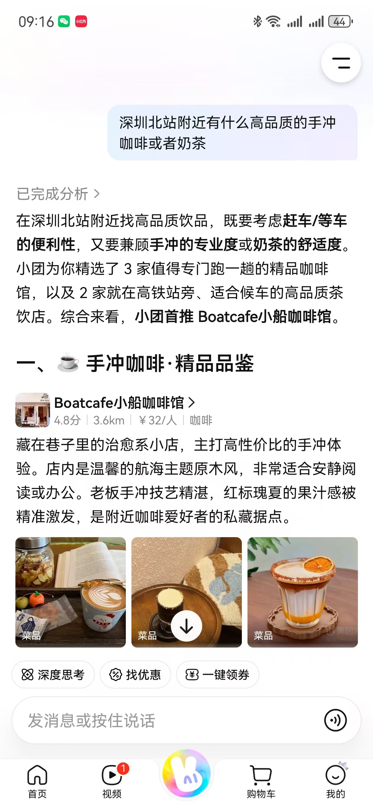 点进去一看,原来是一个AI助手,我就尝试问了一下,附近有什么高品质的手冲咖啡或者奶茶?没想到推荐的几家中,也有之前去过体验不错的店,看来这个小助手的推荐挺靠谱啊。这个给我们出差在外,或者不熟悉的来说,真的太实用了,看到还有「找优惠」和「一键领券」等实用功能,省时省力还省钱啊,所以,五一期间出去旅游的朋友,又多一个身边的AI小助手。