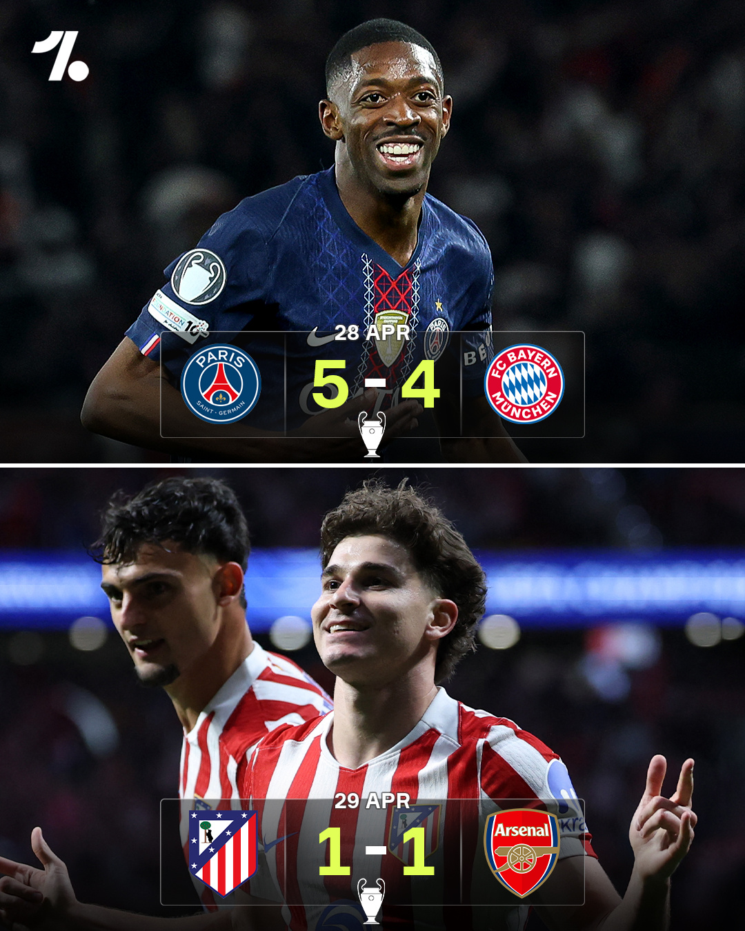 欧冠半决赛第一回合,巴黎圣日耳曼5比4拜仁慕尼黑;马德里竞技1比1阿森纳!