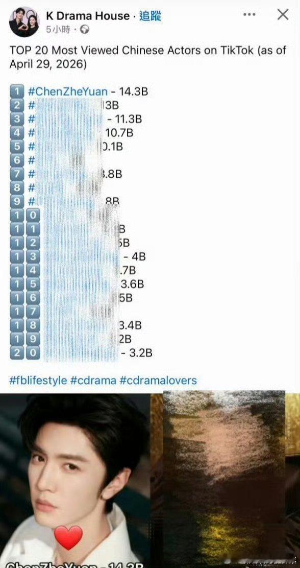 TikTok浏览量最多的20位中国男演员,陈哲远排名第一!陈哲远 拥有95后一番男演员最高收视率实绩
