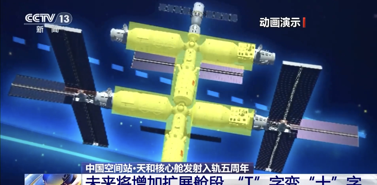 现在的空间站组合体,是一个稳定运行的“T”字形组合体。未来的“扩容”计划,将在目前的核心舱前向对接口增加一个新的扩展舱段,从而形成“十”字形,按任务计划,这个新的扩展舱段比天和核心舱还要大,它将提供多个新的停泊口,并为航天员增加1个出舱口,满足当前货运飞船、载人飞船频繁往来和航天员出舱的需求。