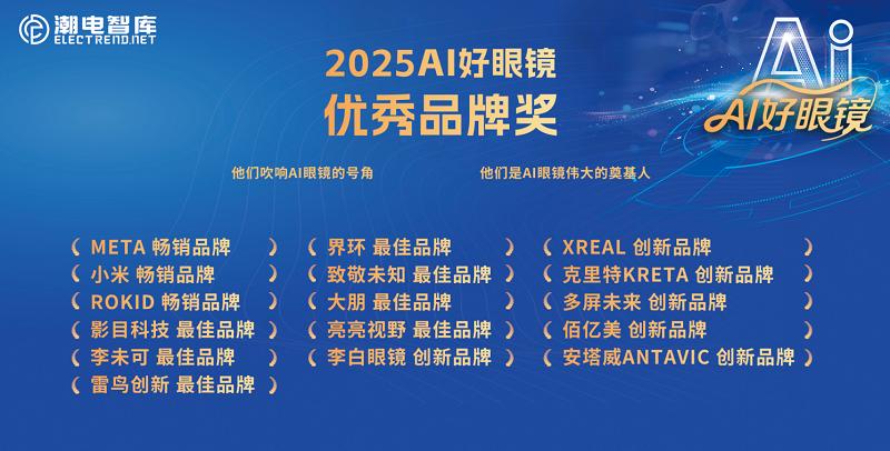 META(畅销品牌)、小米(畅销品牌)、Rokid(畅销品牌)、影目科技(最佳品牌)、李未可(最佳品牌)、雷鸟创新(最佳品牌)、界环(最佳品牌)、致敬未知(最佳品牌)、大朋(最佳品牌)、亮亮视野(最佳品牌)、李白眼镜(创新品牌)、XREAL(创新品牌)、克里特KRETA(创新品牌)、多屏未来(创新品牌)、佰亿美(创新品牌)、安塔威(创新品牌)