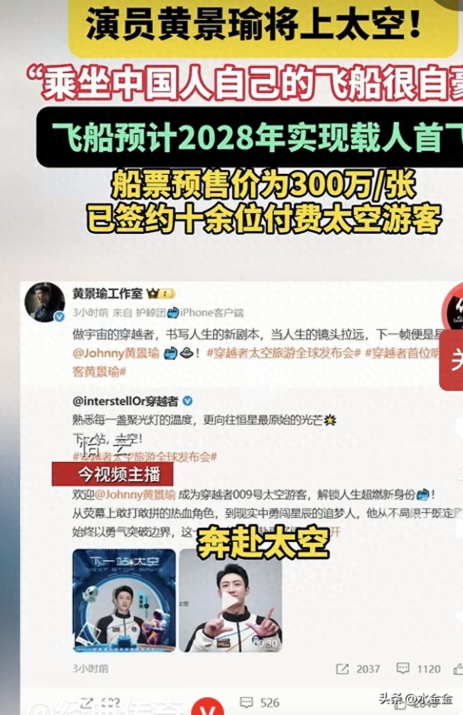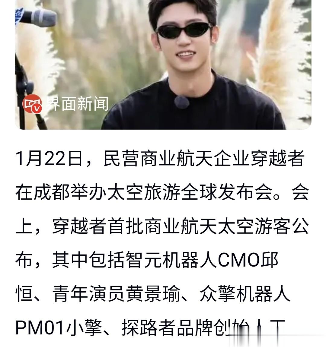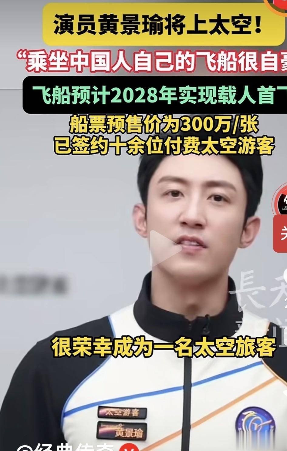 就在今天,黄景瑜工作室直接官宣:“做宇宙的穿越者,书写人生的新剧本”,还带上了#穿越者太空旅游全球发布会#的话题,实锤了他要当太空旅客的事!