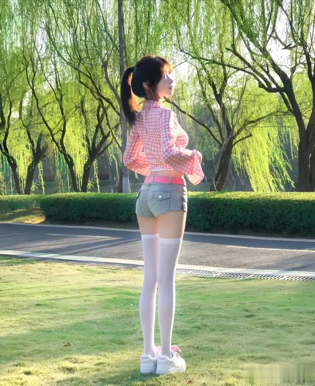 粉色少女风,女大学生短裙倩影,牛仔短裤引领独特时尚。