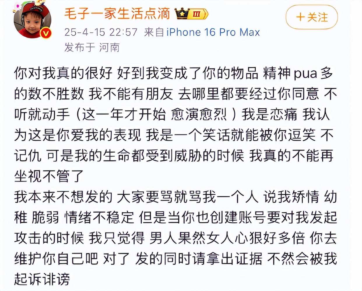 现在毛子的账号已被平台封禁,但他仍在境外社交账号上发文:“女人太强势才会这样”。这种甩锅话术正在被国际反家暴组织关注,有志愿者正在翻译证据链,准备向联合国妇女署提交。