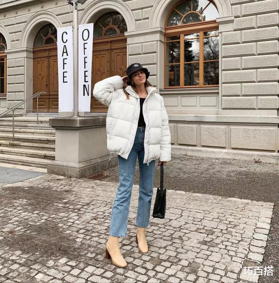 市面上的白色羽绒服有多种搭配模板,除了可以和运动裤搭配出休闲舒适的效果外,和牛仔裤搭配,也能穿出别样的精致和利落。
